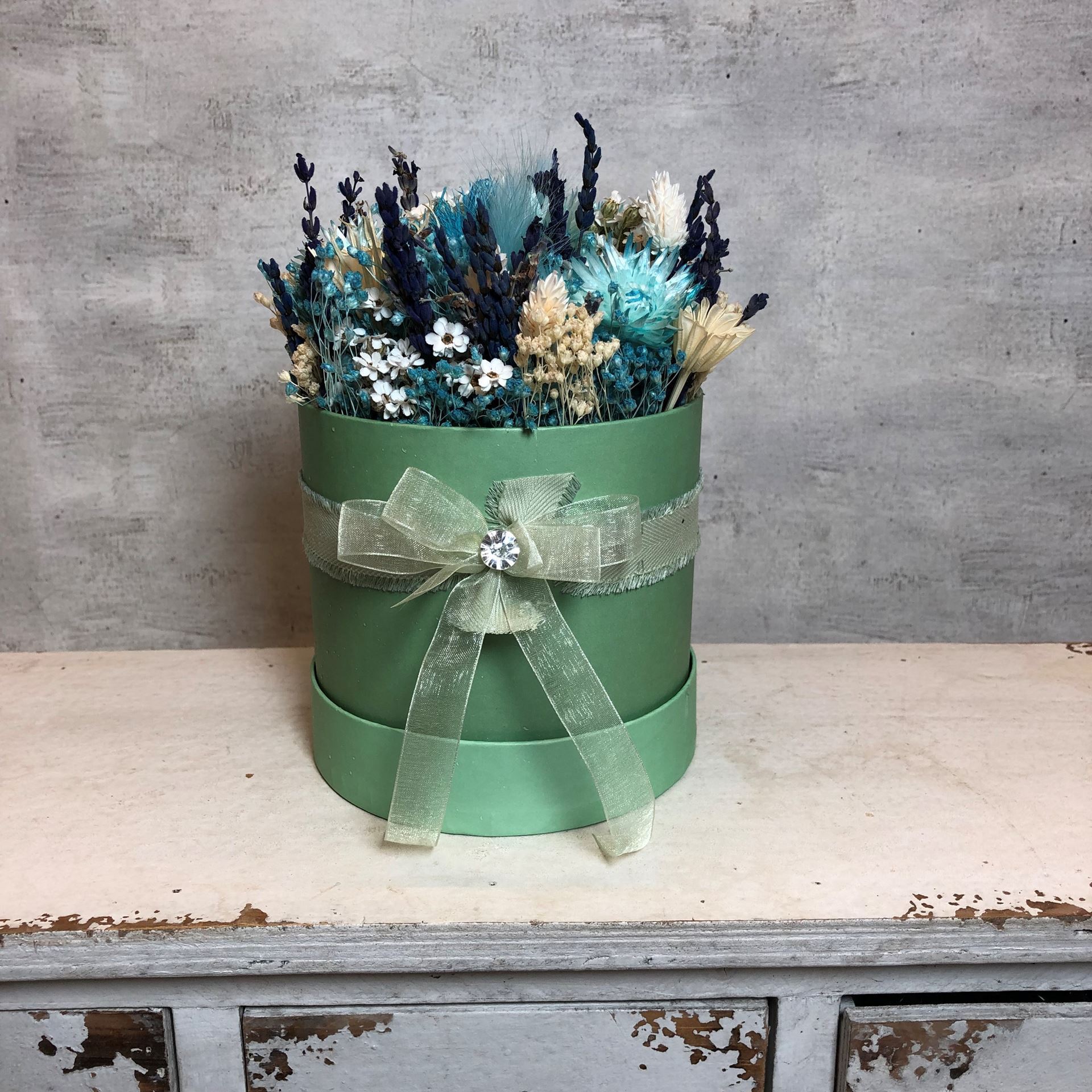 • Die Blumenboxen aus Trockenblumen werden von uns individuell zusammengestellt und können so in Anordnung und Farbe variieren.