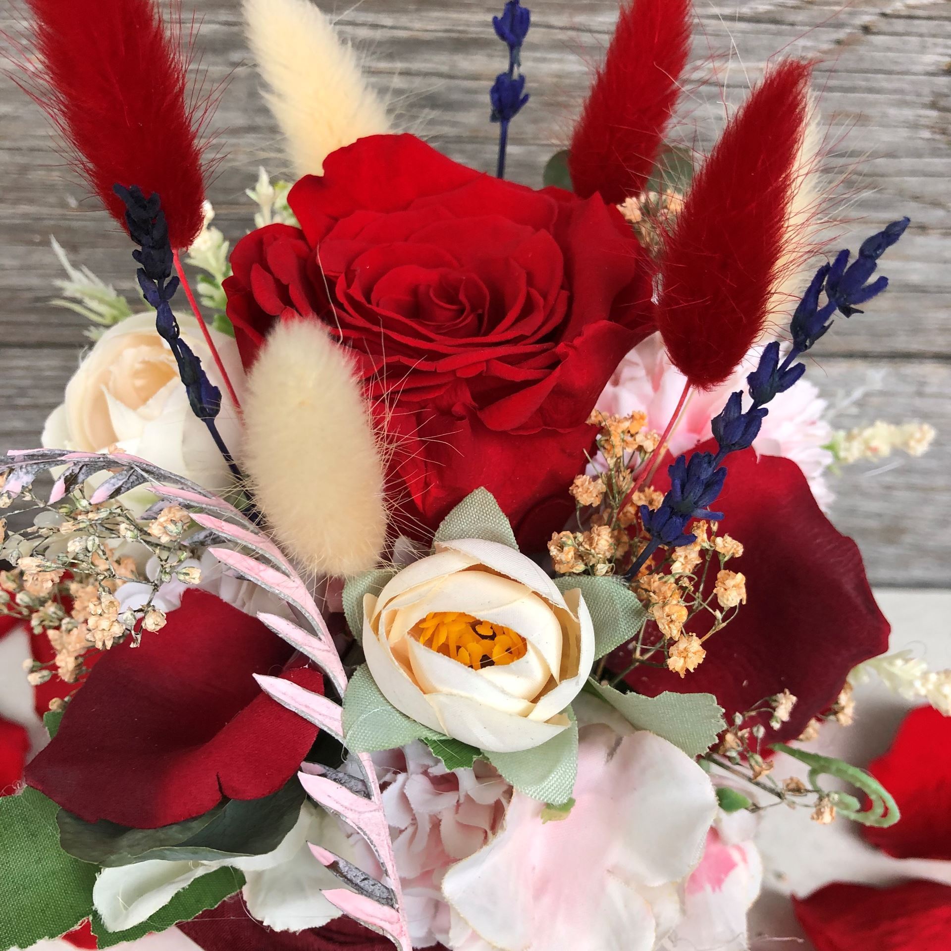 Unser Blumenkörbli mit stabilisierter Infinity – Rose, Bandschmuck und » Thank you » – Anhänger ist aus trendigen Trockenblumen und kunstvollen Textilblumen gestaltet. Es ist mehr als nur eine Dekoration – es ist eine Liebeserklärung in Form von Blüten.
