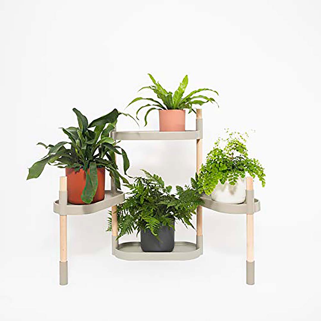 Das CitySens Pflanzenregal ist ein modularer und anpassbarer Pflanzenständer. Modell mit 4 Tabletts in mattgrau.