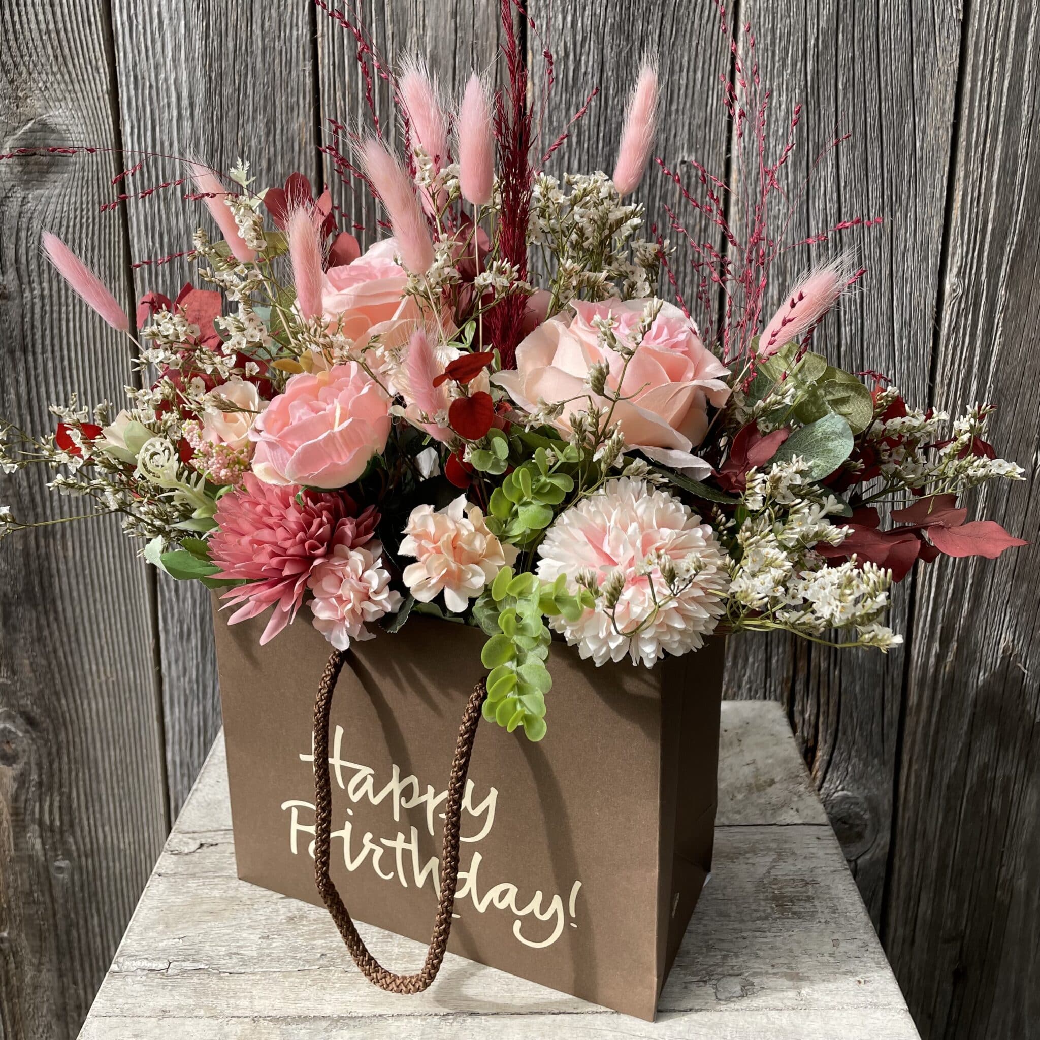 Mit diesem trendigen Geschenk wird die Überraschung unvergesslich. Unsere Blumentasche ist mit trendigen Trockenblumen und Textilblumen gestaltet.