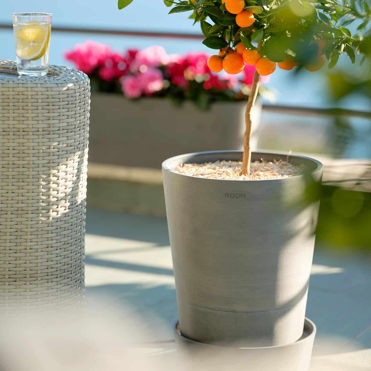 Der neue Boum Topf 15L Pro verfügt über ein Bodenvolumen von 15 Litern und eine Pflanztiefe von 29 cm. Er ist damit geeignet für Zimmerpflanzen, Kräuter, Gemüse, Blumen, kleine Sträucher und Bäumchen. Er ist verfügbar in drei zeitlosen Farben, die sich in jedes Zuhause einfügen. Kapillardochte ziehen Wasser aus dem integrierten Reservoir des Topfs und sorgen so für optimale Bodenfeuchte. Ein Schwimmerventil reguliert die Wasserzufuhr zum Reservoir. Durch eine dezente, einfach zu installierende Verschlauchung wird der Topf mit der Boum Bewässerung verbunden. Damit werden Pflanzen mehrere Wochen zuverlässig mit Wasser versorgt. Der Topf besteht aus hochwertigem, 80% recyceltem Mineral-Kunststoffgemisch mit Handfinish. Er ist dekorativ, stoss- und bruchfest, leicht zu bewegen, UV- und frostresistent.