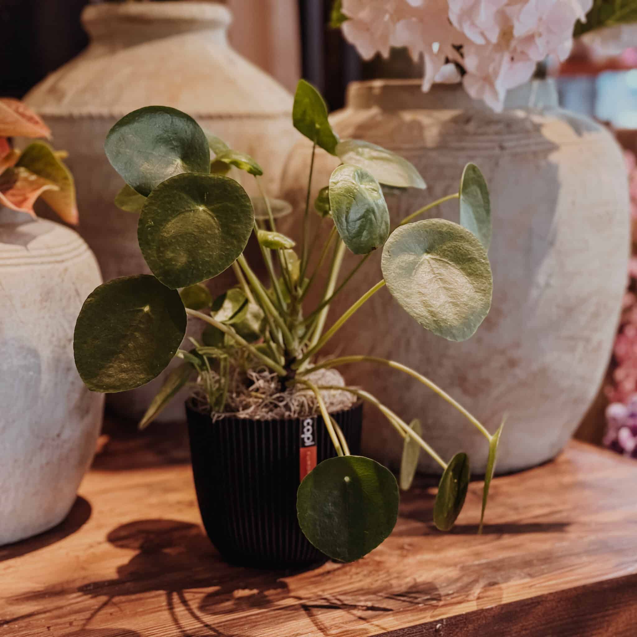 Die Pilea ist eine sehr ansprechende und wirkungsvolle Zimmerpflanze. Sie mag volles Licht ohne direkte Sonneneinstrahlung und benötigt einmal in der Woche Wasser. Es darf keine Staunässe im Topf entstehen und kann durch das herausheben der Pflanze gut kontrolliert werden.