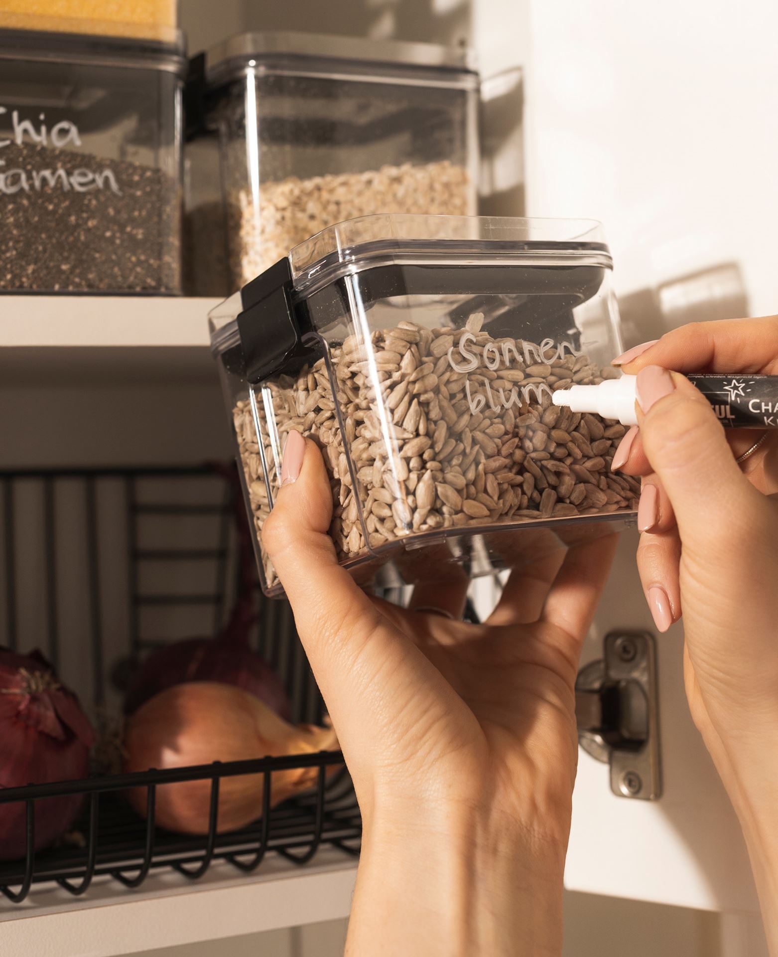 Beschrifte deine Vorratsdosen, Kräutertöpfe oder Menütafeln mit unserem praktischen KREUL Kreide-Tafelstift, welcher mit flüssiger Farbe, die schnell trocknet, saubere, deckende Linien zeichnet, die sich mit Wasser bei Bedarf leicht abwaschen lassen.