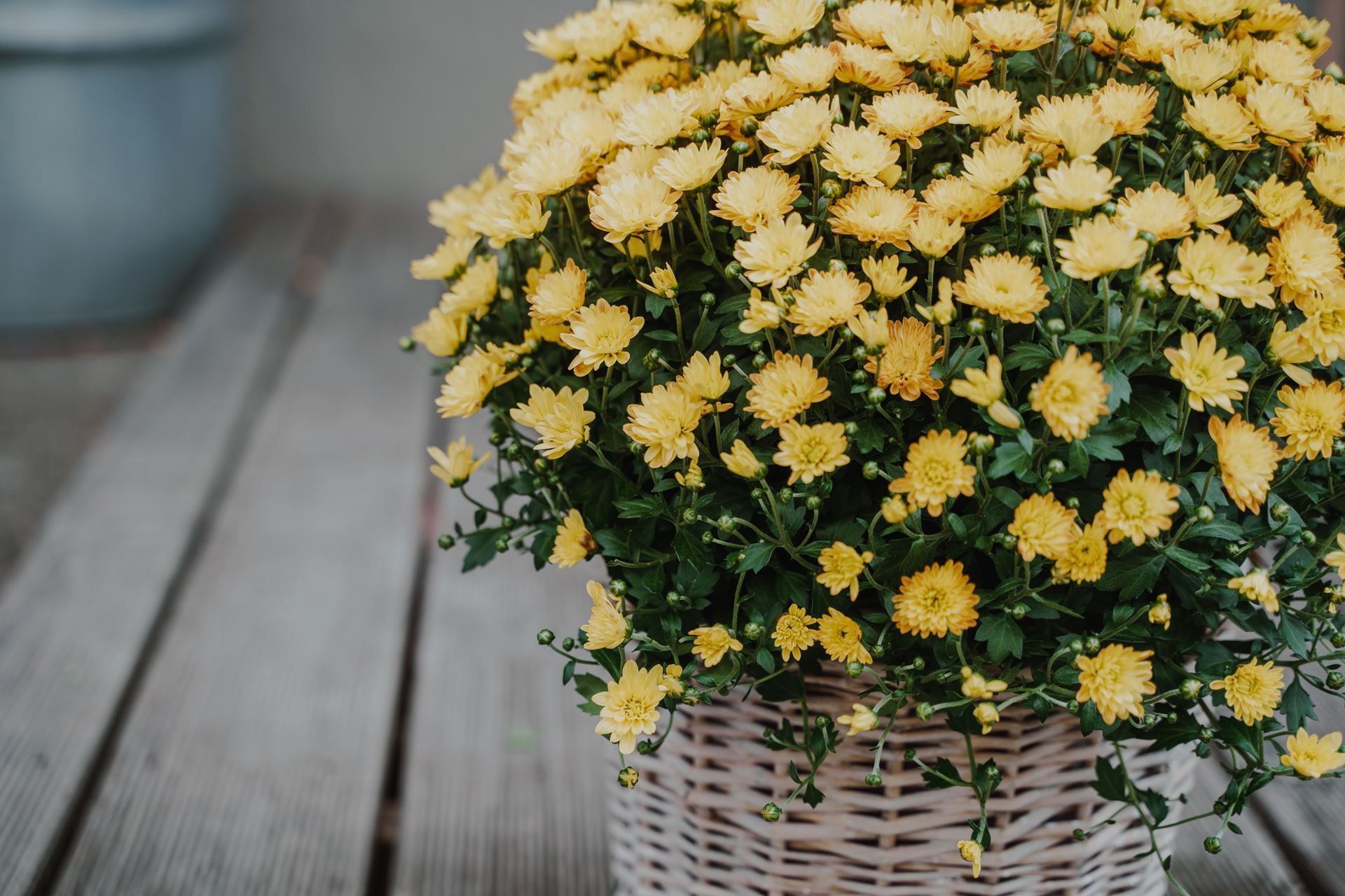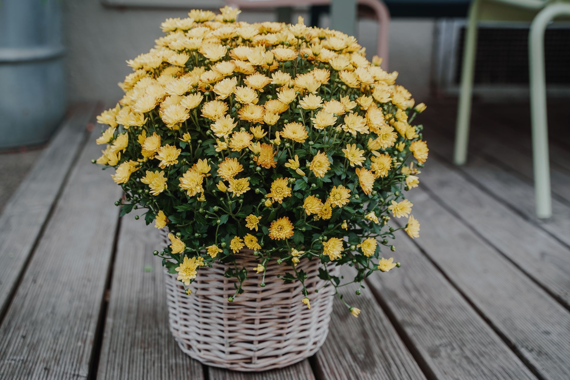 Diese Chrysanthemen Pflanze hält bis zum ersten Frost bei guter Pflege und wird in einem Korb überbracht.