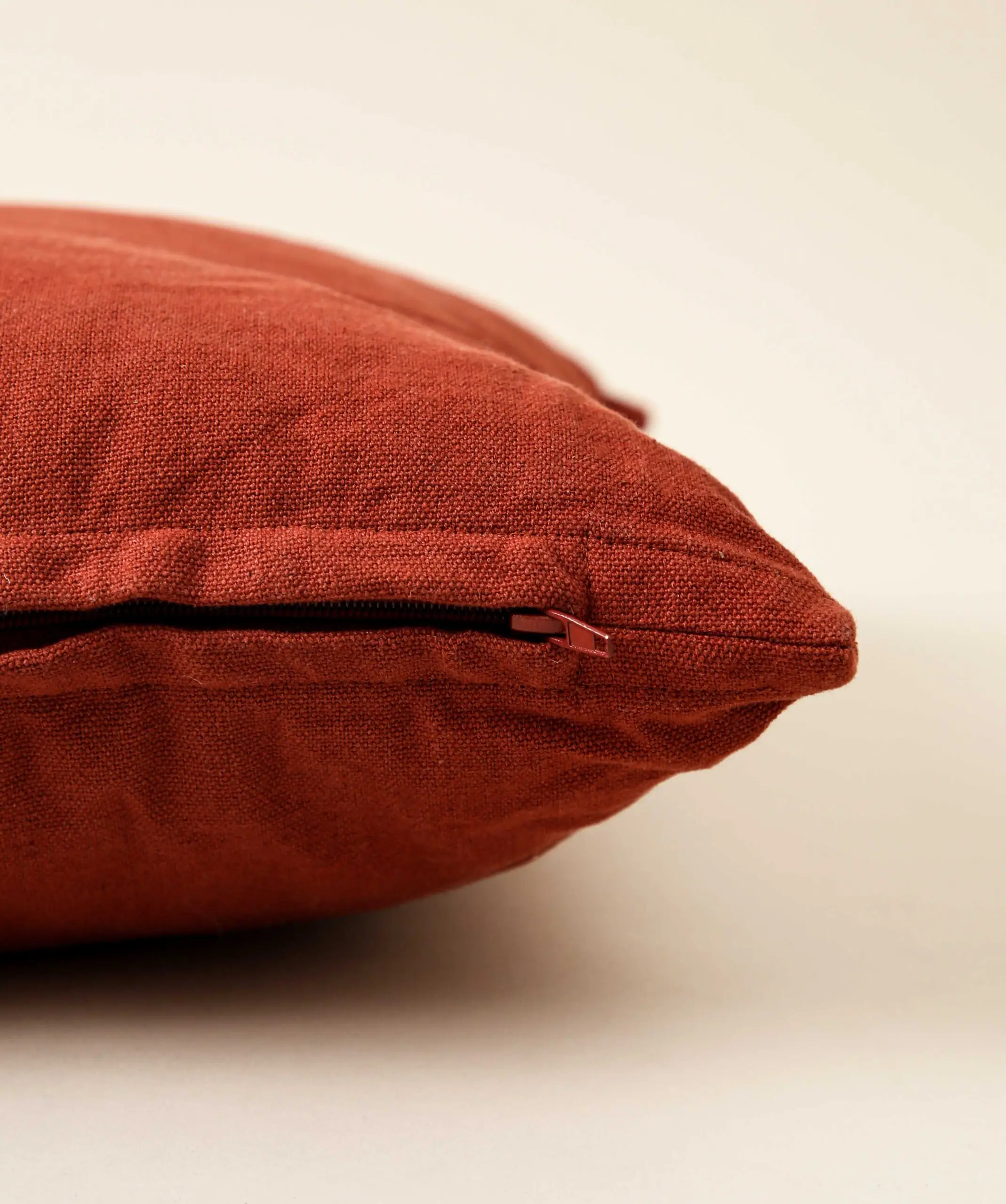 Aus zeitloser Baumwolle geschaffenes, dunkelrotes Zierkissen in schlichtem Design mit natürlicher Faserstruktur. Dank des seitlich eingearbeiteten Reissverschlusses lässt sich der Bezug bei Bedarf entfernen und waschen.