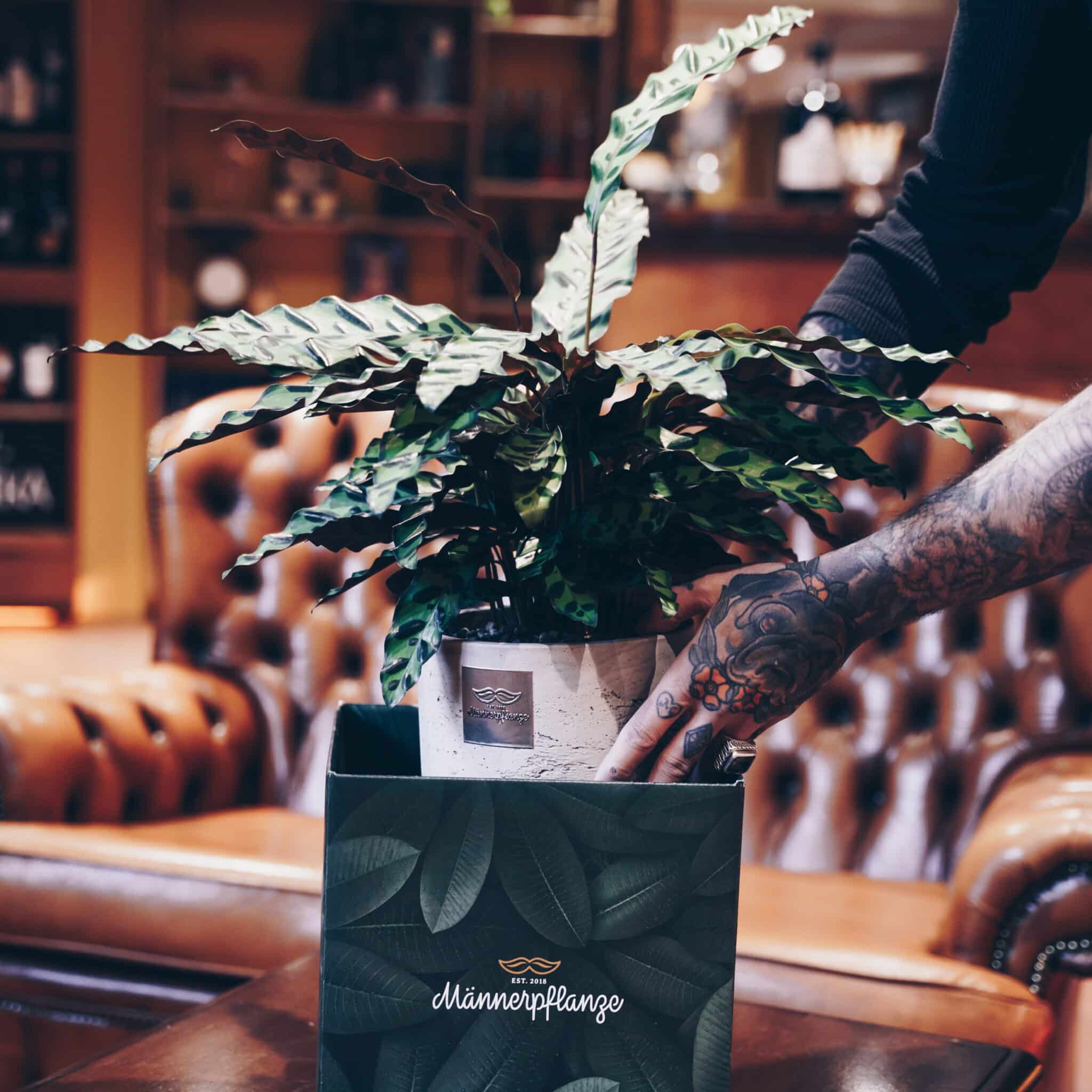 Die Männerpflanze wird mit einer passenden Postkarte (in der jeweiligen Sprache des Lieferorts) und in einer stylischen Männerpflanzenbox geliefert.