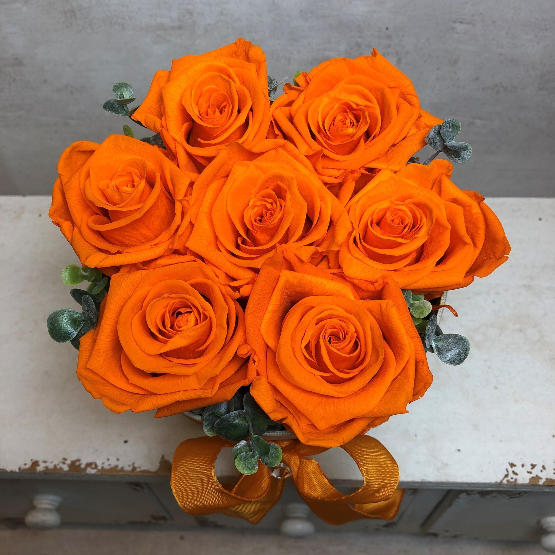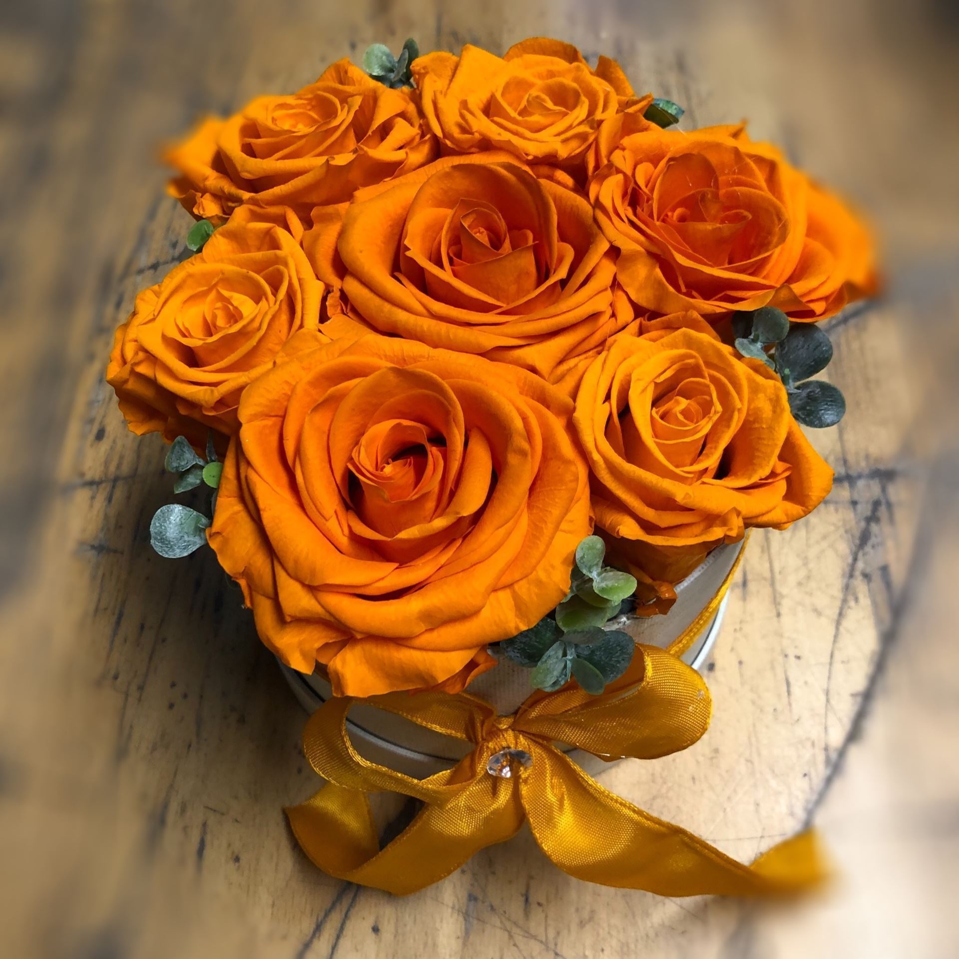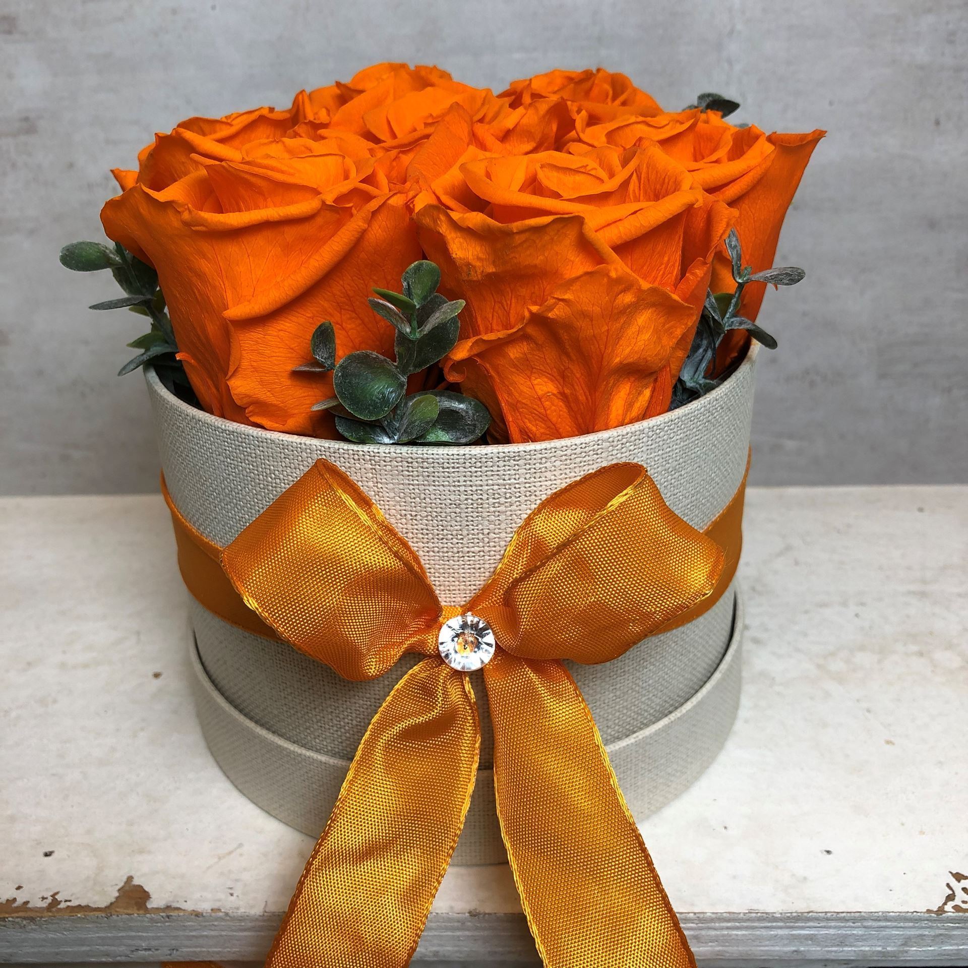 Wunderschöne edle Rosenbox Ø ca. 15cm mit 7 stabilisierten orangen Rosen mit Band und Schmuckstein edel ausgeschmückt