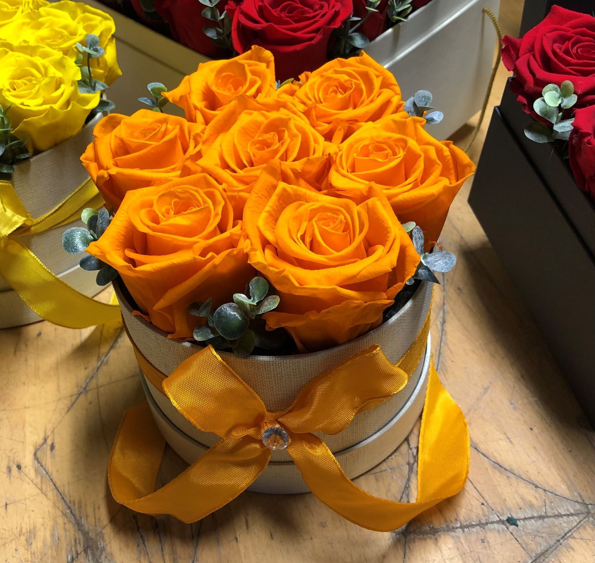 Wunderschöne Rosenbox, mit echten orangen Rosen, die mit einer speziellen Methode stabilisiert (haltbar gemacht) wurden.
