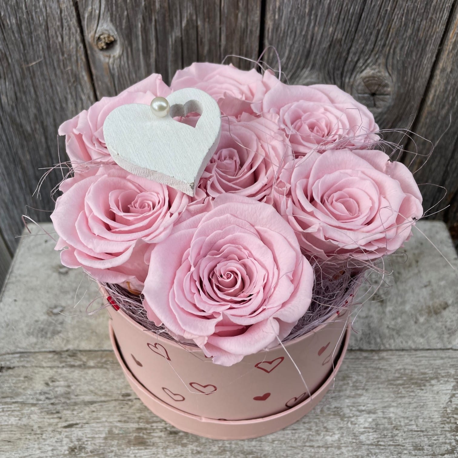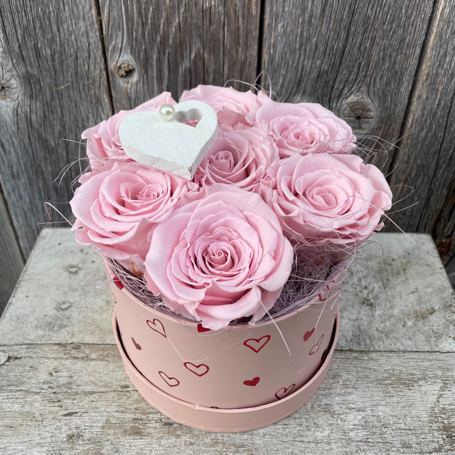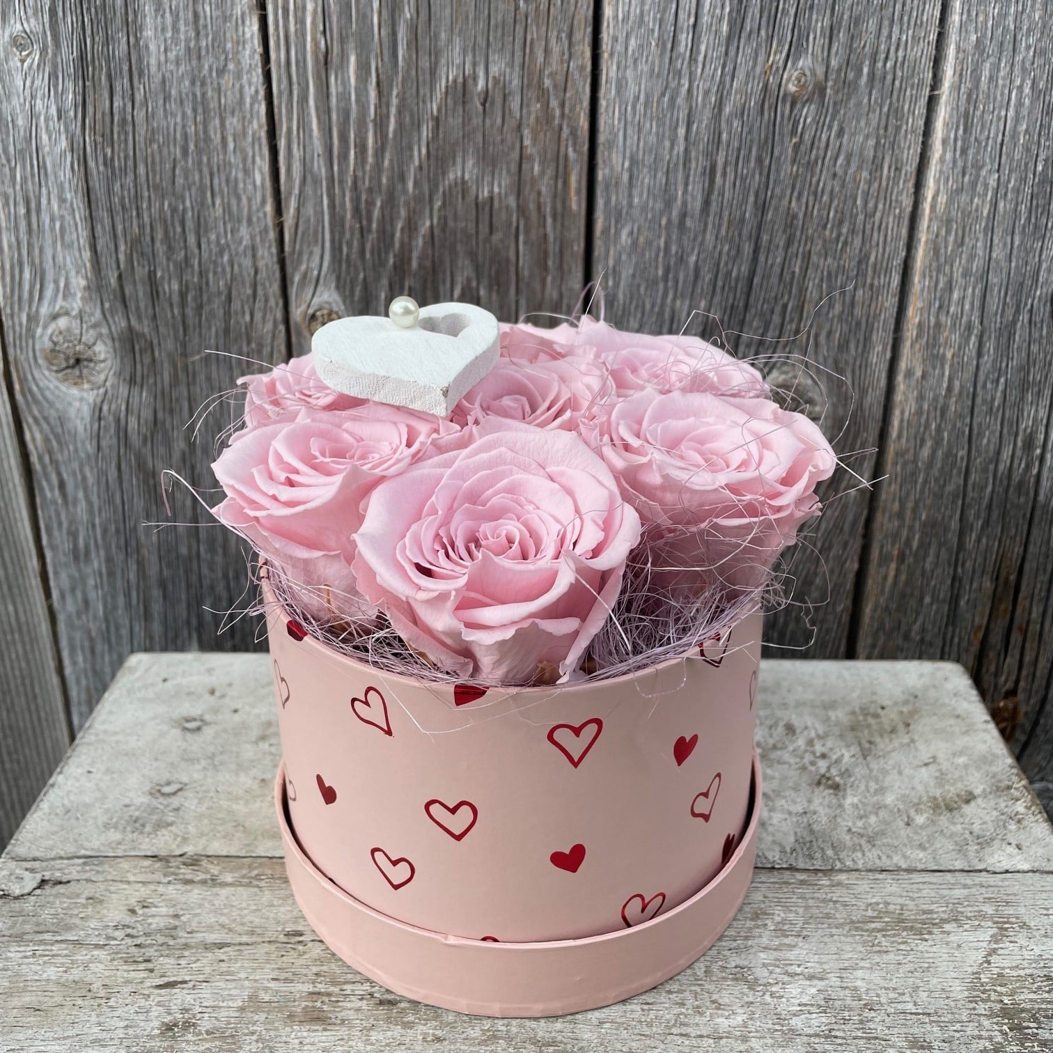 Die elegante, runde Flower-Box in rosa ist mit einem Herz und einer Kunstperle geschmückt und eignet sich als Geschenk der Liebe zu jedem Anlass, sei es zur Hochzeit, zum Valentinstag, Muttertag oder «einfach so». Die Rosenbox wird von Hand und mit viel Liebe gestaltet. Sie eignet sich auch als haltbarer Schmuck und Wohnaccessoire. © by Atelier Leutwyler, Ebikon
