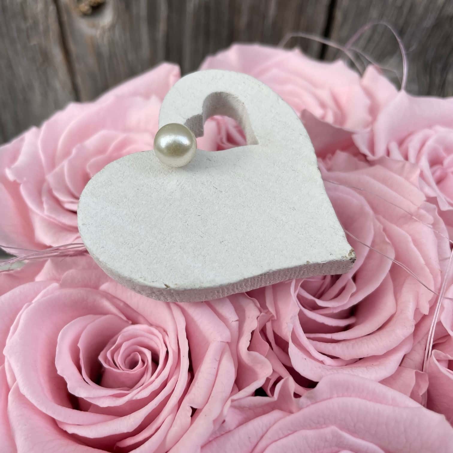 Wunderschöne edle runde rosa Rosenbox mit Herzmotiv und passendem Herz mit Perle geschmückt © by Leutwyler Floristik Luzern