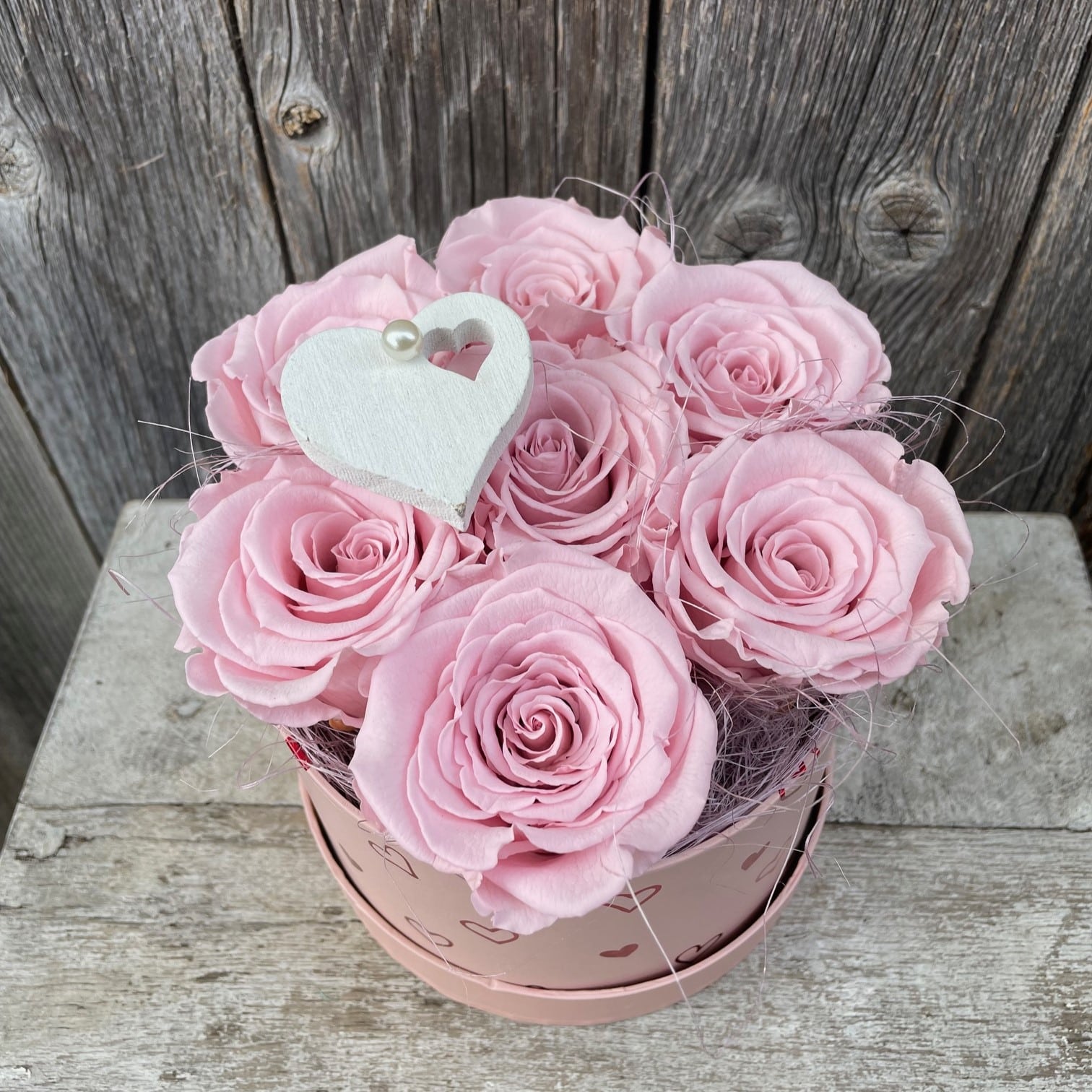 Rosenbox – rund mit Herzmotiv, in rosa, mit 6 rosa, echten, stabilisierten Rosen Ø ca. 15 cm
