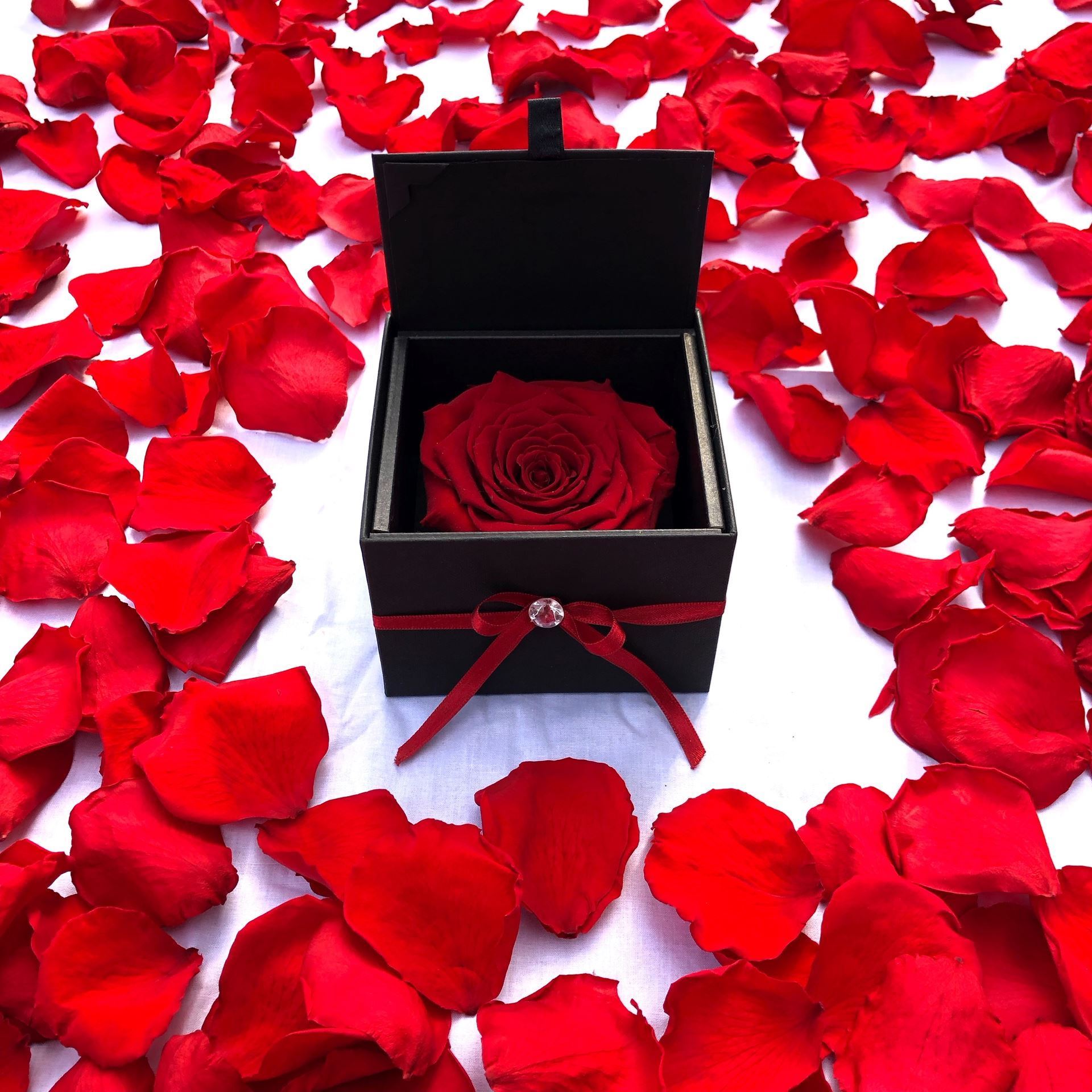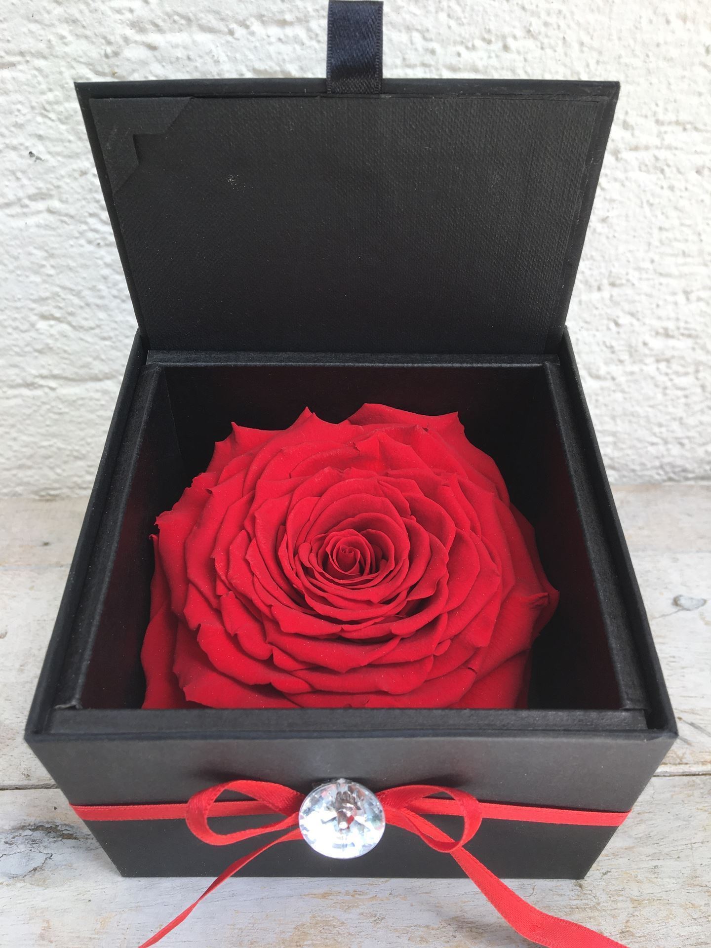 Details: 1 grosse rote Rose, quadratische schwarze Box, Grösse ca L 10.5cm / B 10,5cm / H. 8cm ca. 2 -3 Jahre haltbar. Wichtig! Der Ring als Schmuck ist als Idee eingefügt und gehört nicht zum Produkt!