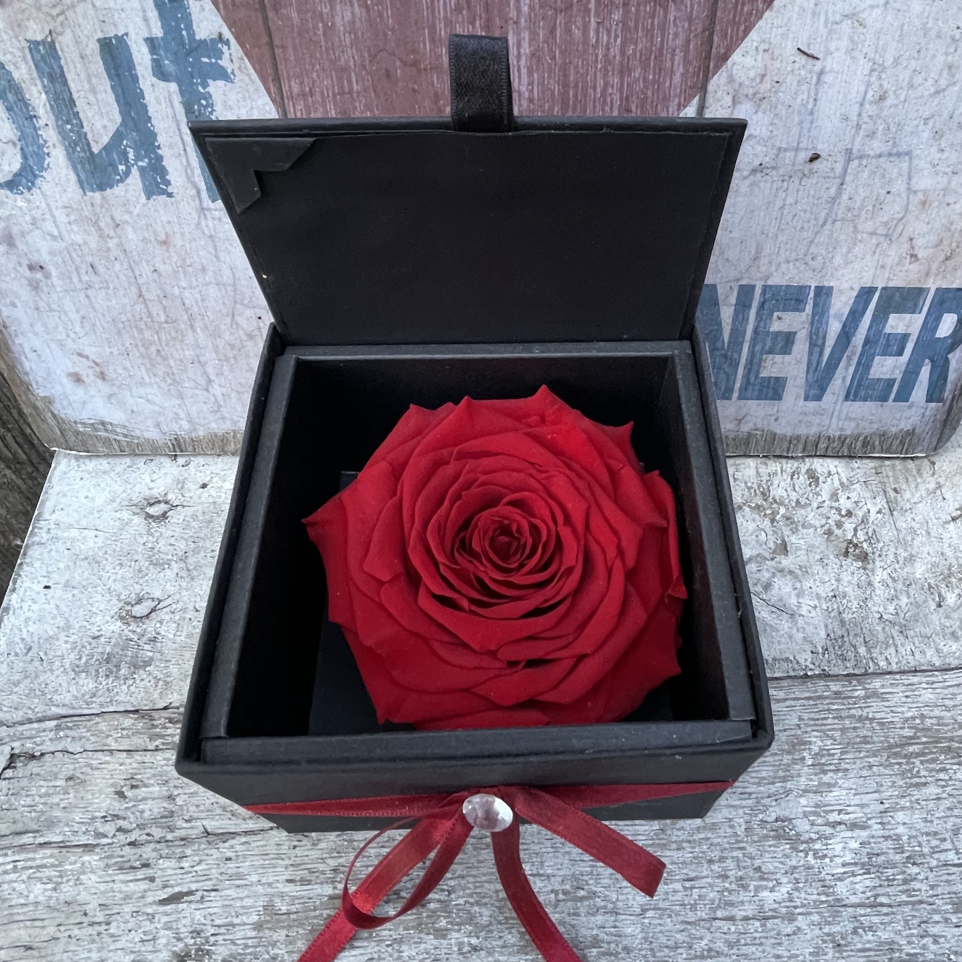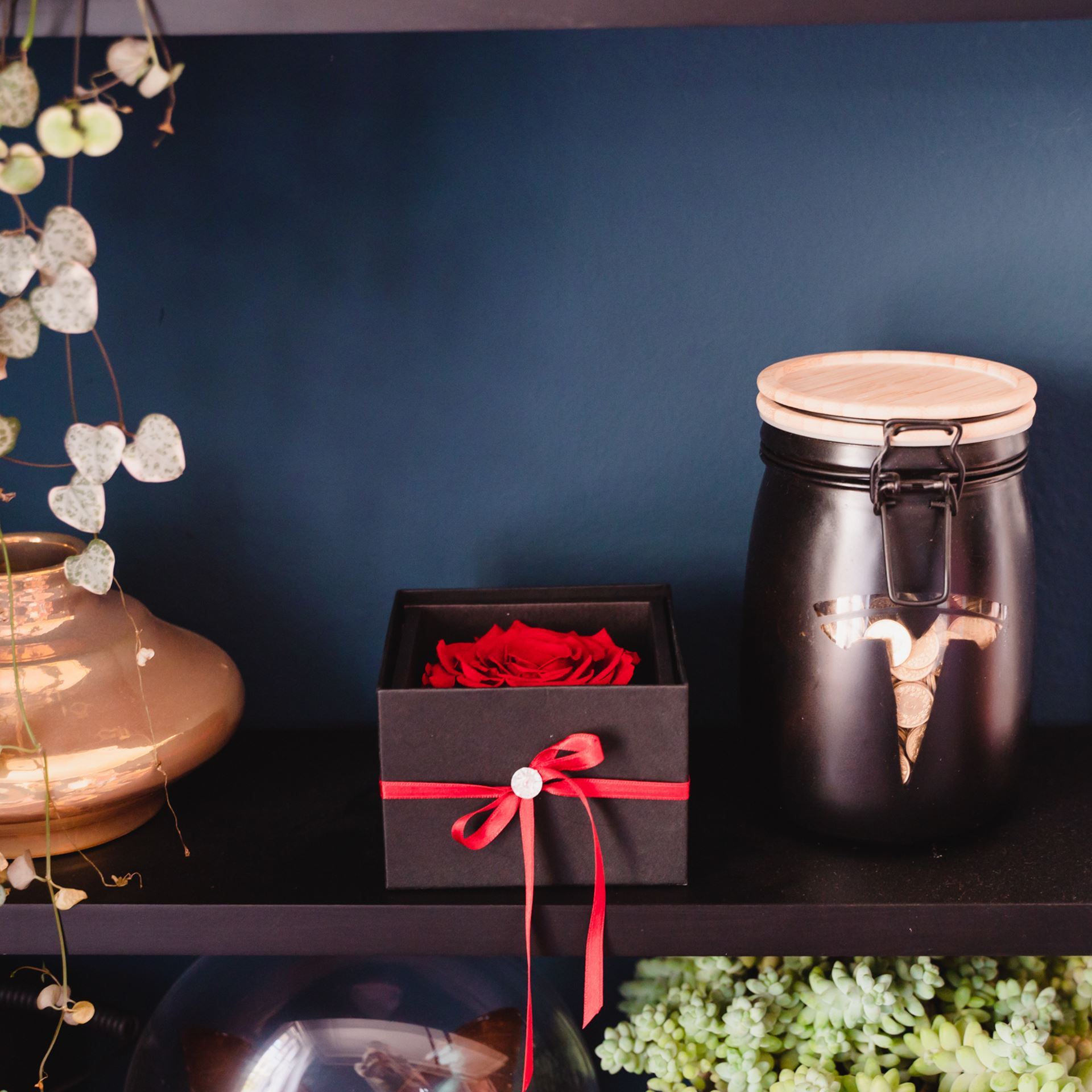 Wunderschöne Rosenbox als Schmuckkästchen in schwarz, mit echter, roter Rose, die mit einer speziellen Methode stabilisiert (haltbar gemacht) wurden. (Gestaltung © by Atelier Leutwyler, Ebikon.
