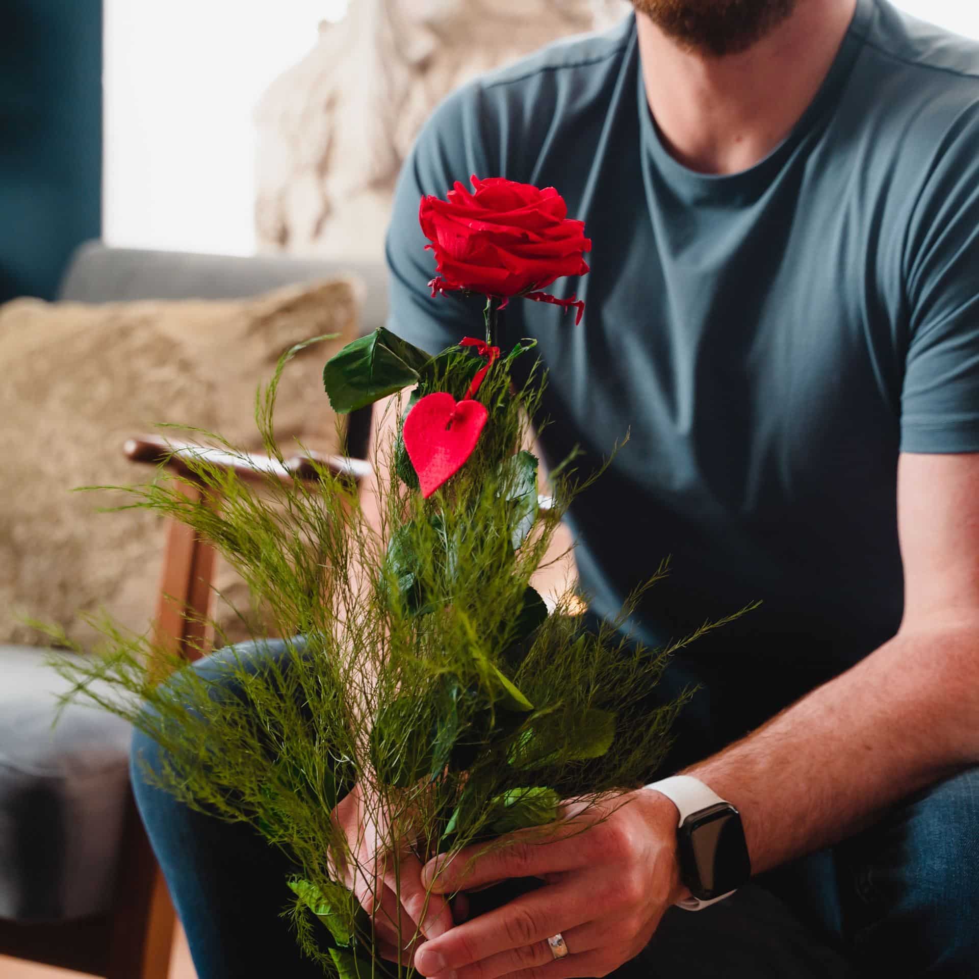 Wunderschöne echte edle rote stabilisierte Einzelrose mit Herz und feinem Grünzweig geschmückt