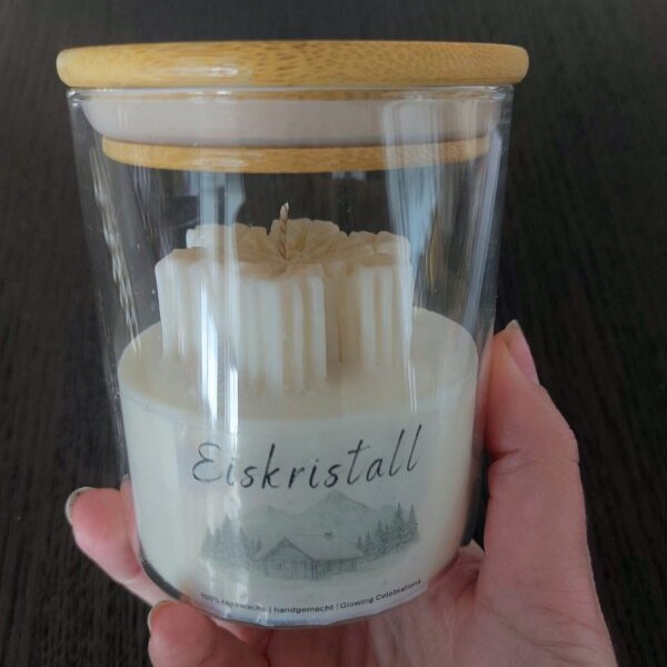 Eiskristall vereint schlichte Eleganz und winterliche Magie. Handgegossen aus 100% Rapswachs und veredelt mit einer feinen Schneeflocke auf der Oberfläche, bringt diese Kerze den Zauber klarer Wintertage in jedes Zuhause oder Büro.