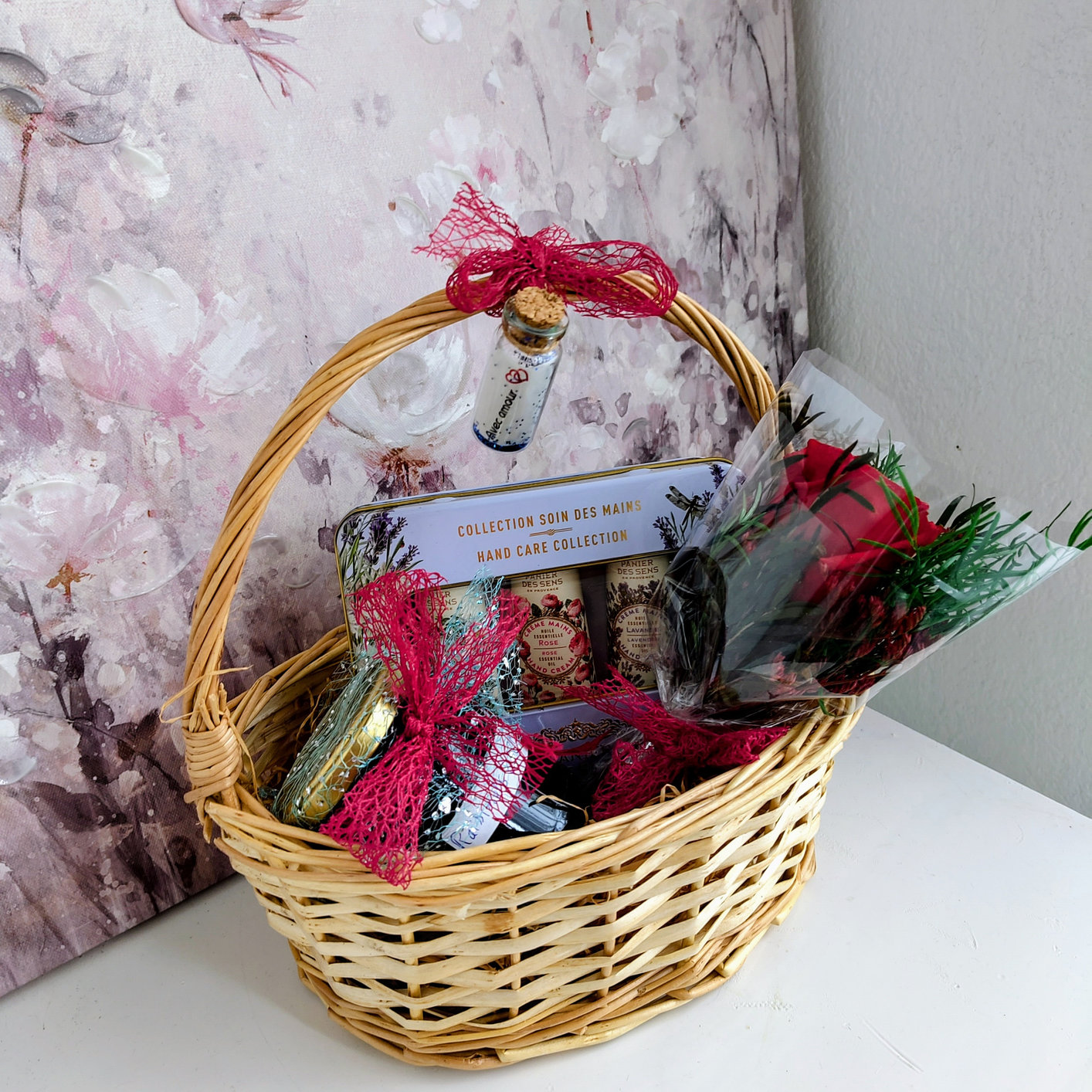 Wunderschöner kleiner Korb für einen Geburtstag oder andere Anlässe. Dieser Korb enthält einen kleinen Strauss mit einer konservierten roten Rose und anderen Pflanzen. Mehrere Jahre haltbar ohne Pflege, eine natürliche Traubenkonfitüre (Zucker und Früchte ohne Konservierungsstoffe, ca. 250 g, handwerklich hergestellt) und eine hübsche kleine Schachtel mit drei Handcremes, natürlich hergestellt in Frankreich (Eisenkraut, Rose und Lavendel).