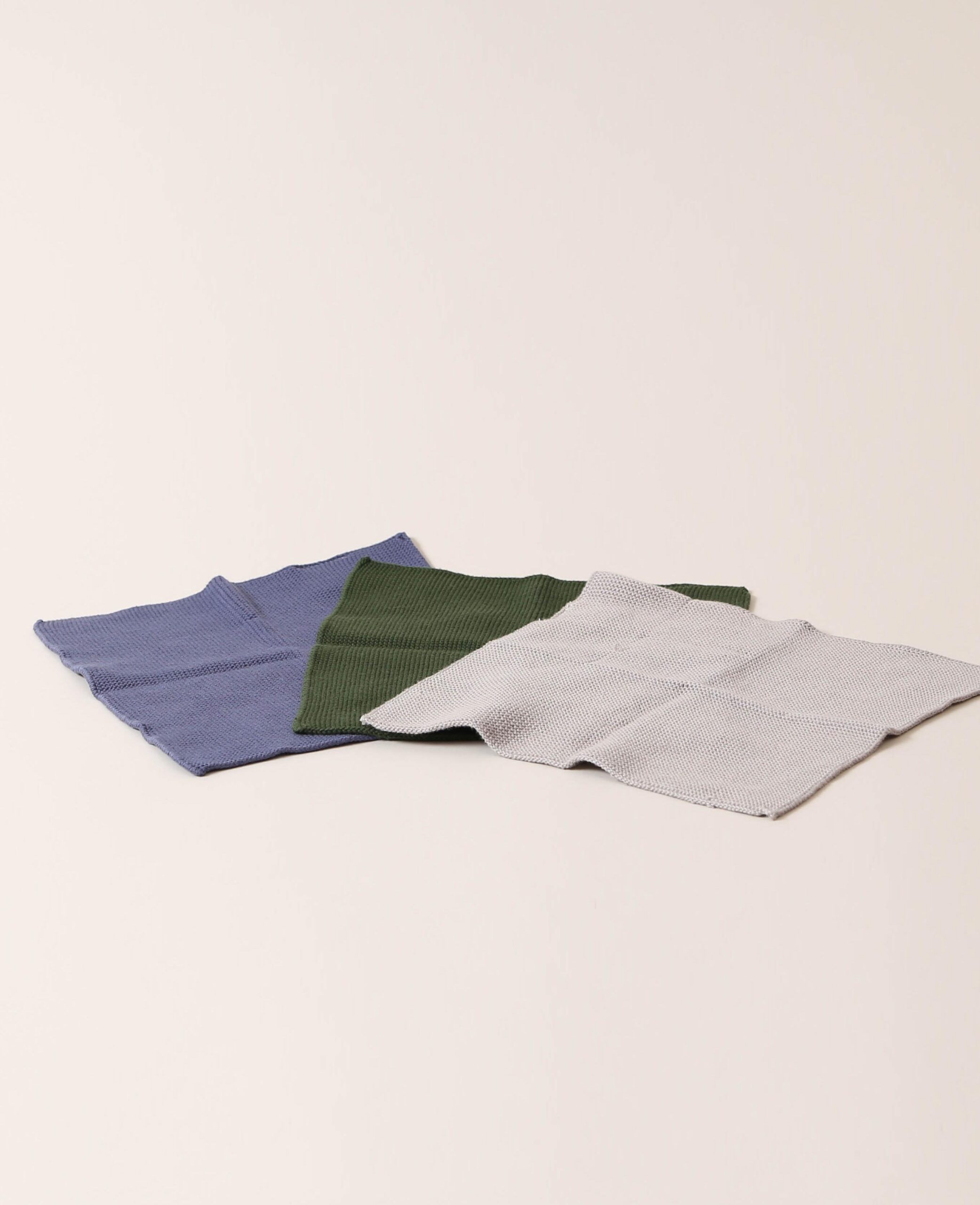 Die drei hochwertigen Spültücher in hellgrau, Tannengrün und marineblau aus gestrickter Baumwolle eignen sich wunderbar zum Spülen oder Putzen der Küche und des Bads. Alternativ lassen sie sich auch ideal als Gesichts- oder Handtücher verwenden, da ihre weiche Struktur, frei von Mikroplastik, für eine sanfte Reinigung sorgt.