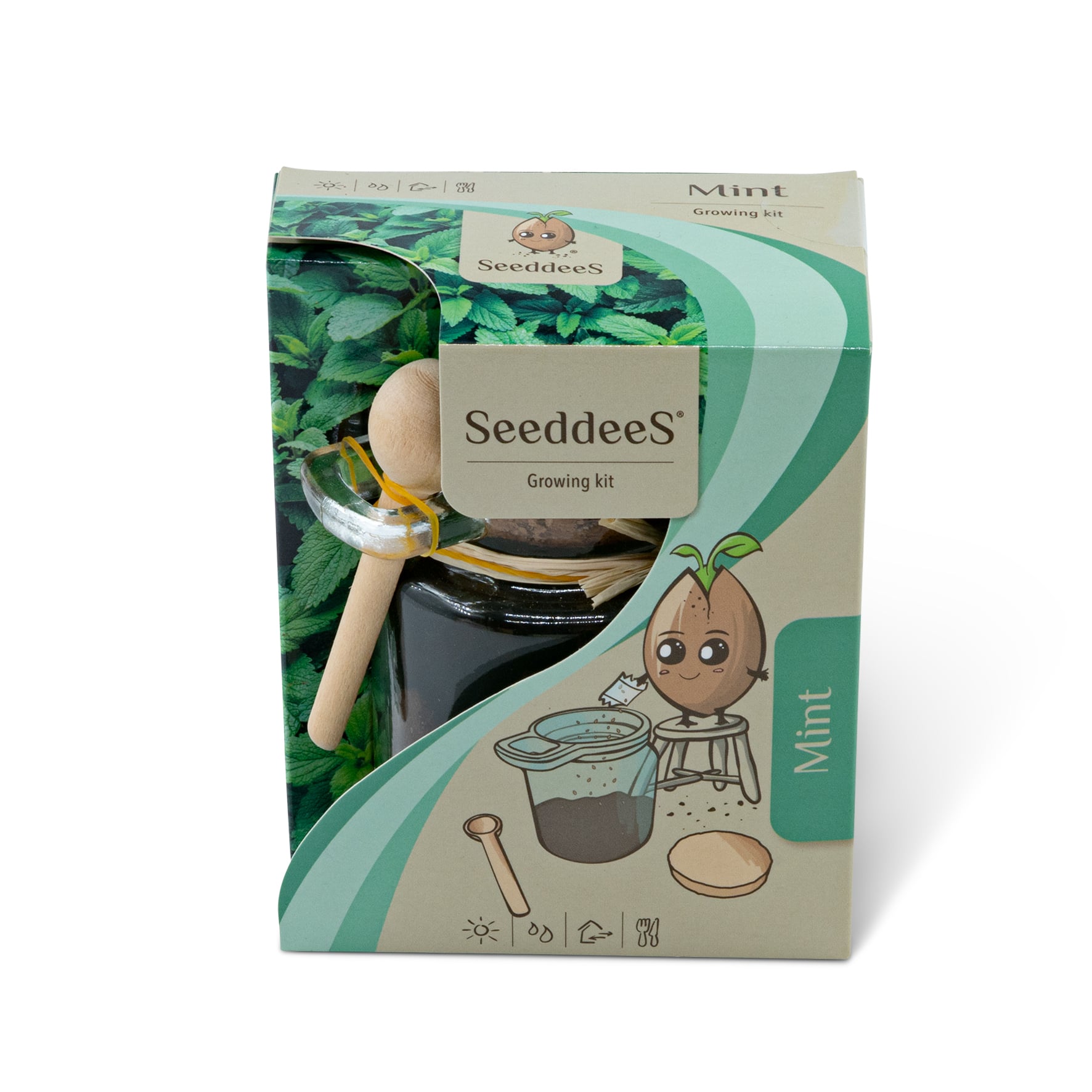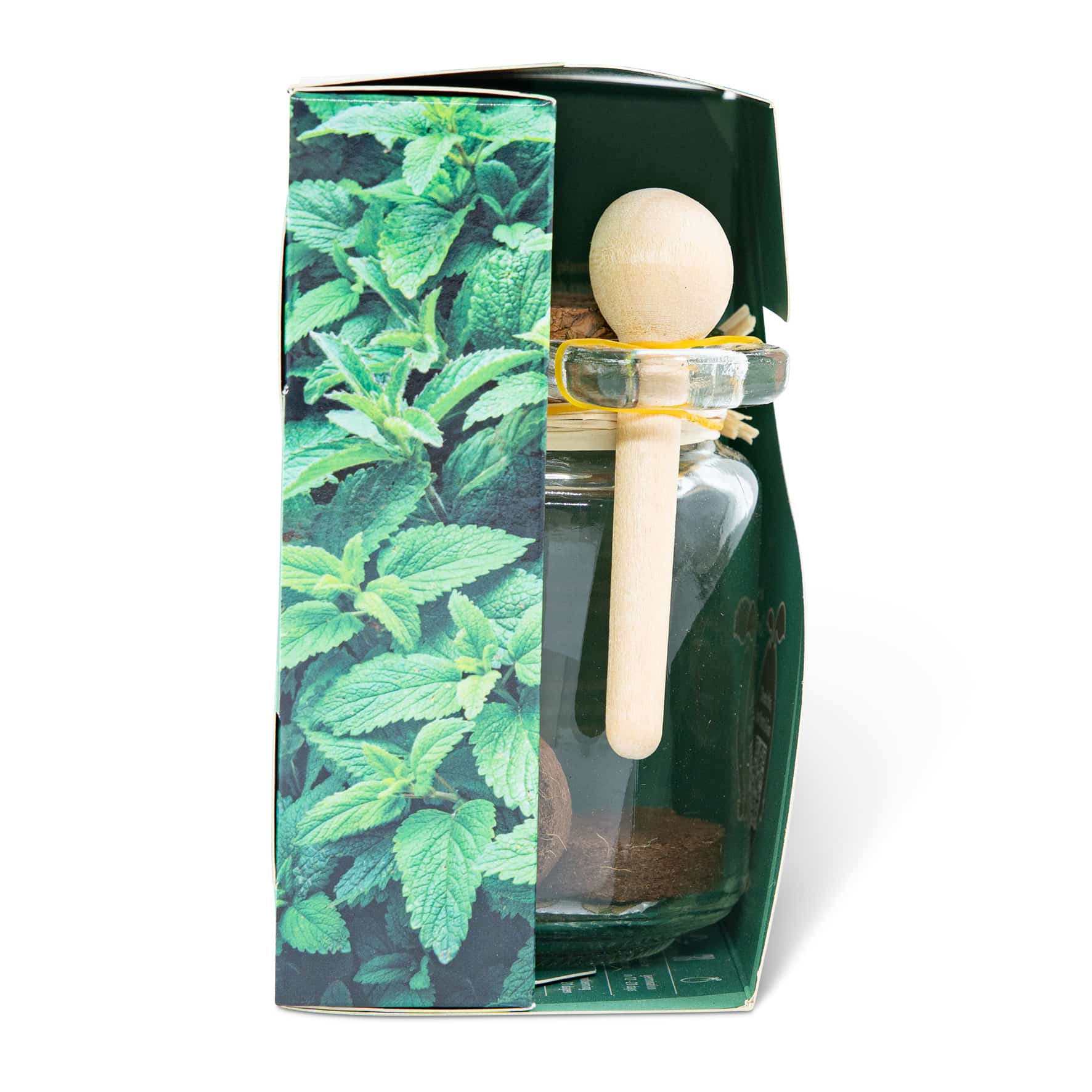 Anzuchtset mit einem Pflanzgefäss aus Glas mit Korkdeckel und Holzlöffel. Nach dem Anbau der Minze trockne die reifen Minzblätter und bewahre sie in dem Glasgefäss auf. Verwende den Holzlöffel, um die Minze zu dosieren und eine köstliche Tasse Tee zu machen.