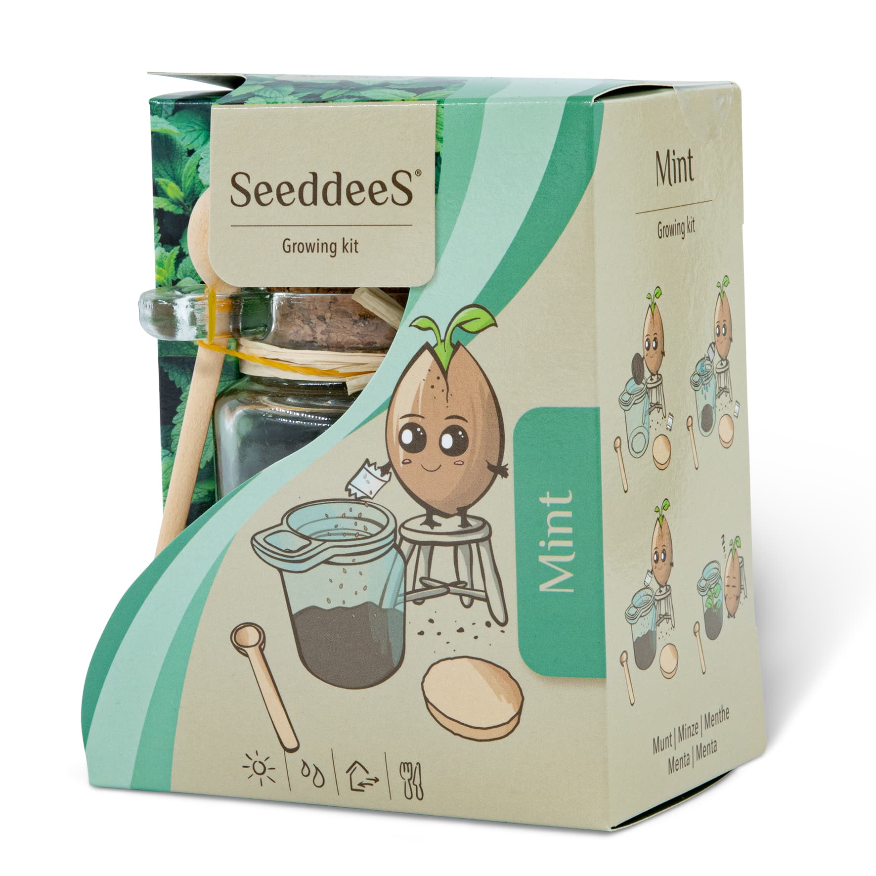 ENTHÄLT: Pflanzgefäss aus Glas mit Korkdeckel und Löffel mit Kokostablette und Minze-Samen.
