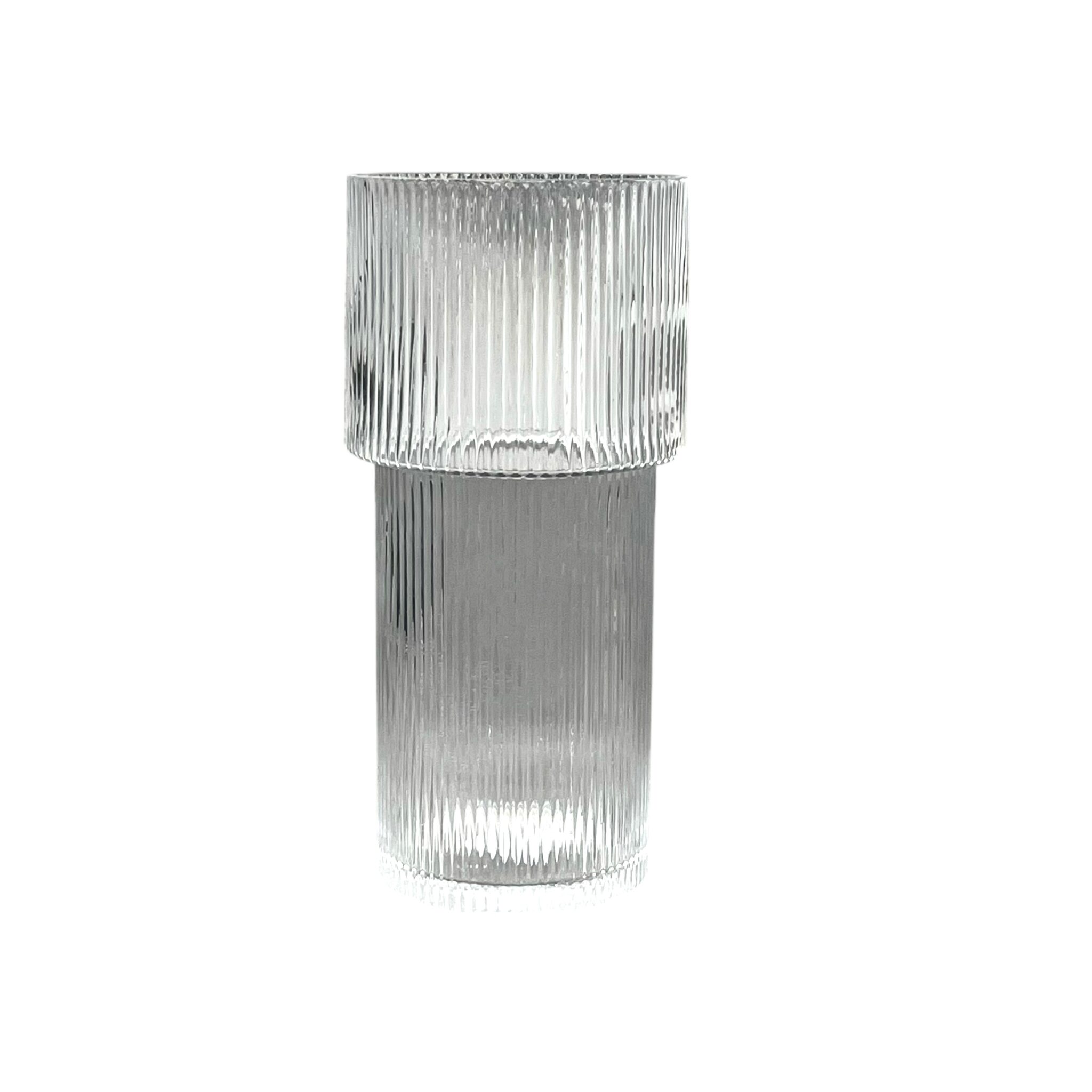 Die Vase „Fluntern“ überzeugt mit schlichter Eleganz und architektonischer Präzision. Ihr gerilltes Klarglas sorgt für spannende Lichtreflexe und eine moderne Textur, die perfekt zu einem reduzierten Wohnstil passt.