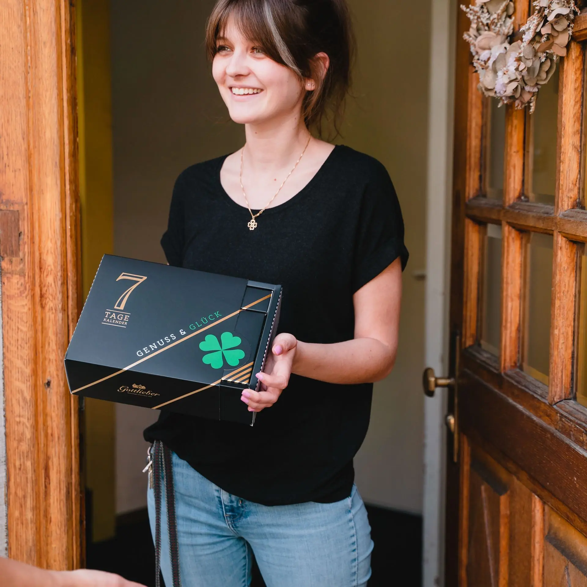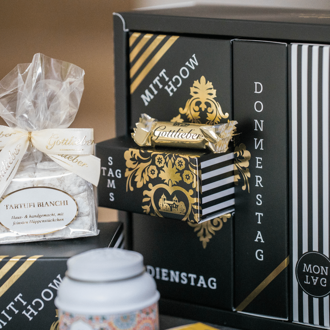 Eine Woche Glück verschenken! Der neue Gottlieber Gourmet-Wochenkalender vereint erlesene Köstlichkeiten unserer Zuckerbäckerei. In jeder der sieben Schachteln verbirgt sich eine süsse Überraschung: knusprige Hüppen, zart duftender Tee, verführerische Tartufi sowie die haus- und handgemachte Pralinécreme «Morgensünde».