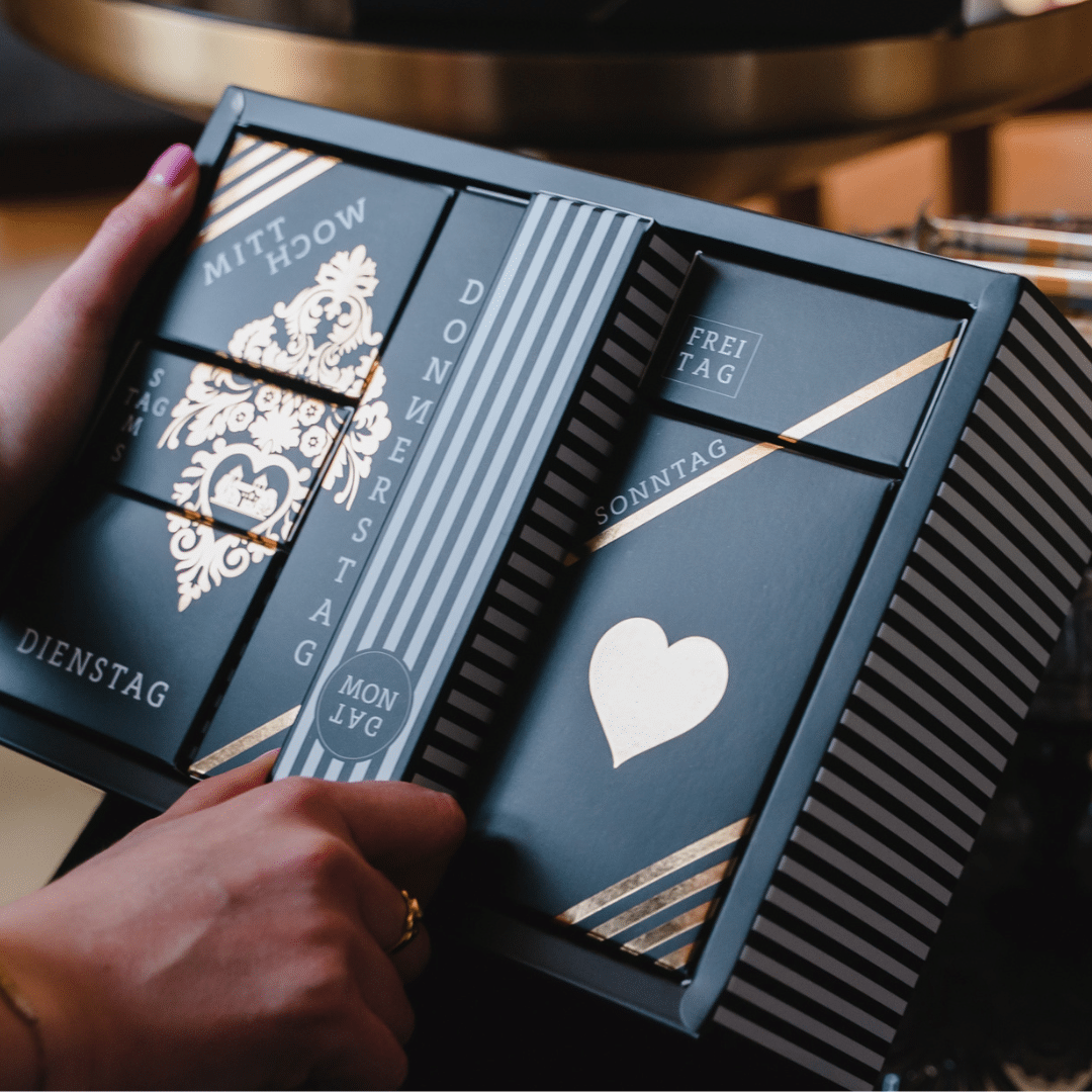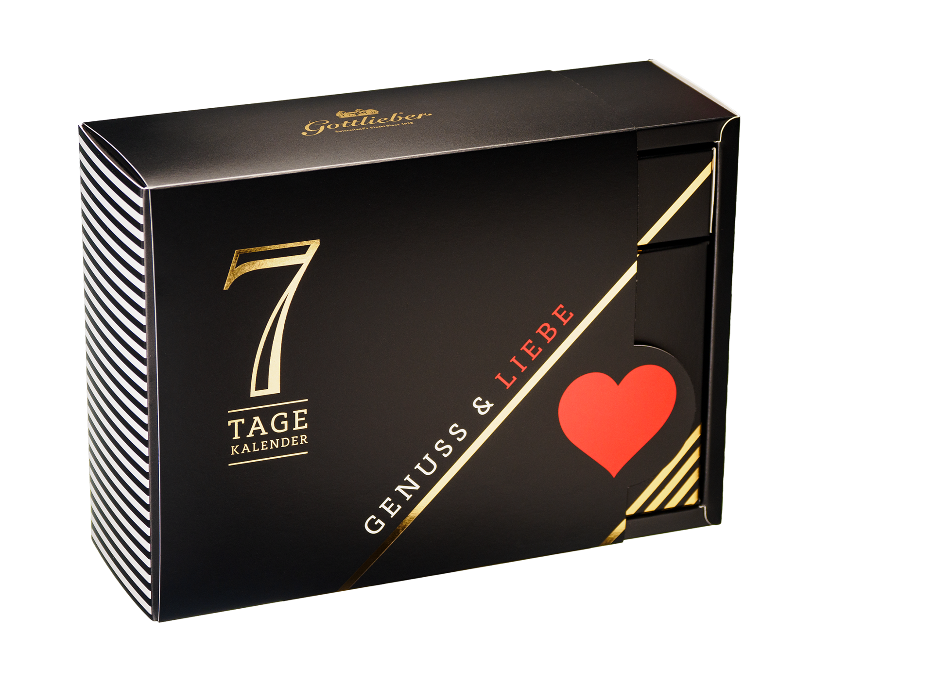 Eine Woche Liebe verschenken! Der neue Gottlieber Gourmet-Wochenkalender vereint erlesene Köstlichkeiten unserer Zuckerbäckerei. In jeder der sieben Schachteln verbirgt sich eine süsse Überraschung: knusprige Hüppen, zart duftender Tee, verführerische Tartufi sowie die haus- und handgemachte Pralinécreme «Morgensünde».