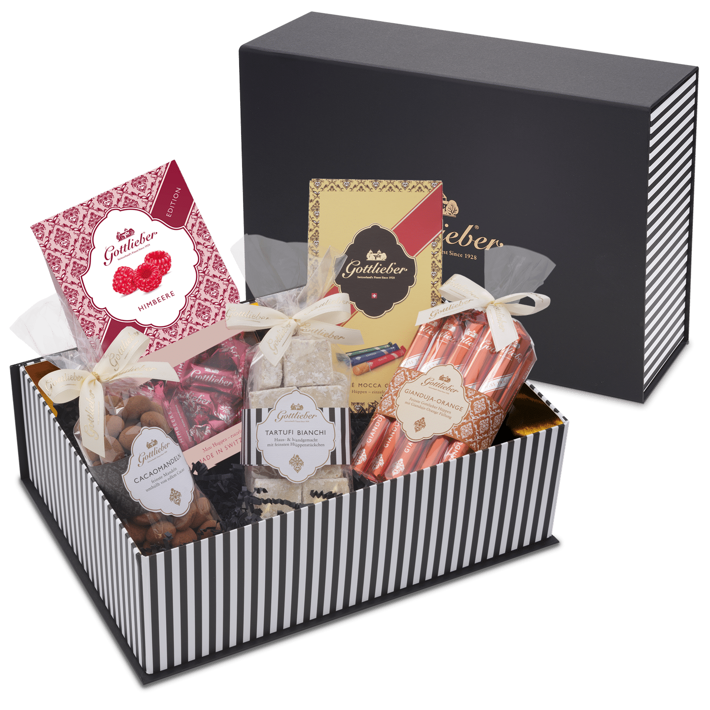 Elegante Geschenkbox mit verschiedenen Gottlieber Hüppen sowie je einem Säckli Cacaomandeln und Tartufi bianchi.