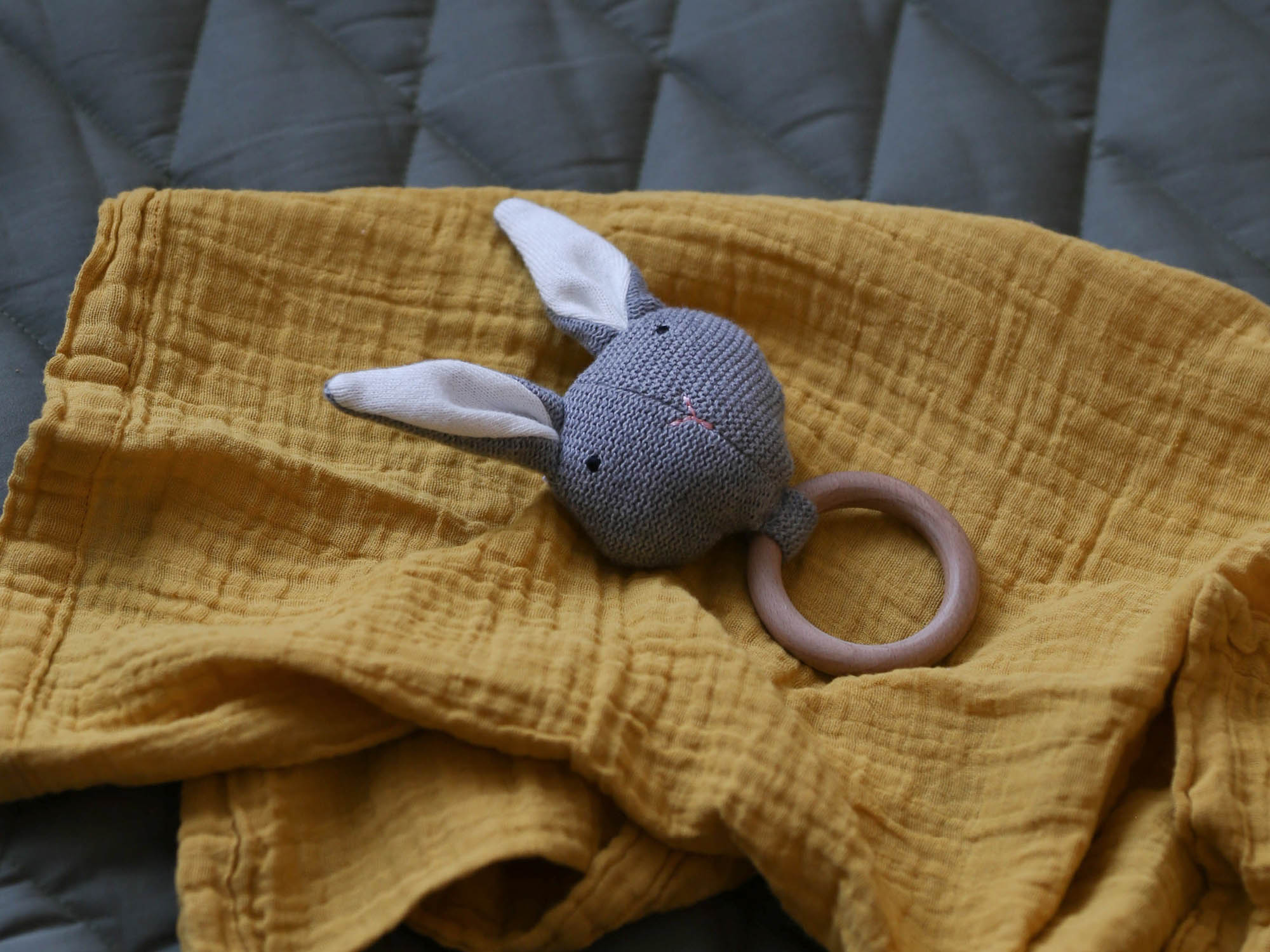 Baby Holz Beissring mit Hase aus gestrickter Baumwolle