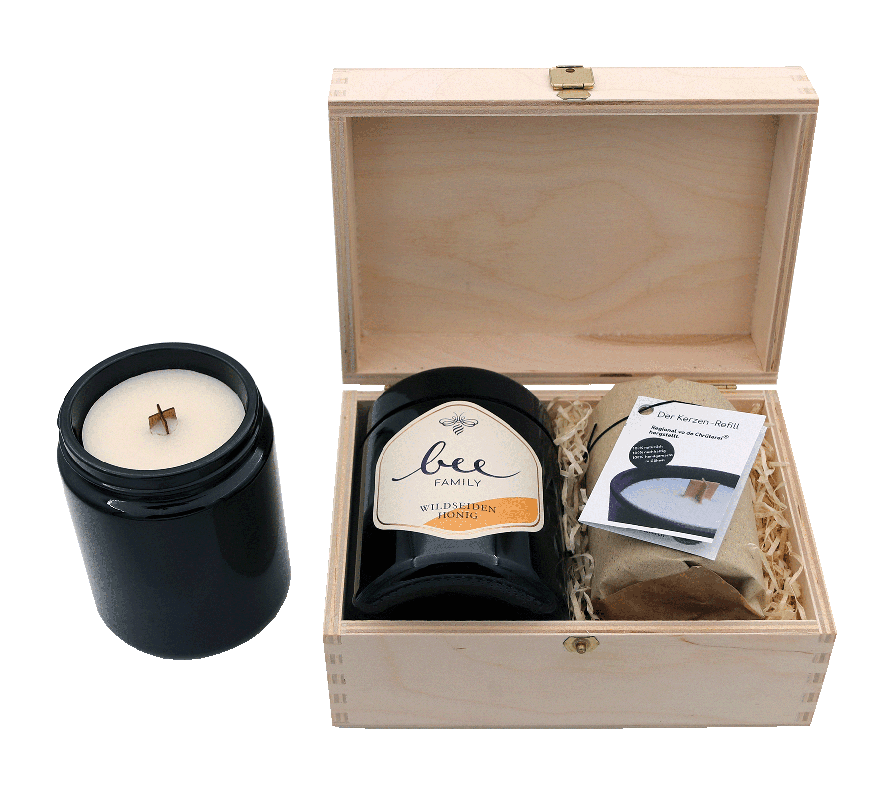 Unser Honigsolo «Honey & More» beinhaltet neben unserem Wildseiden Premiumhonig noch einen Duftkerzen—Refill zur Wiederverwendung für das leere Honigglas – verpackt in unserer Bee-Family Holzbox.