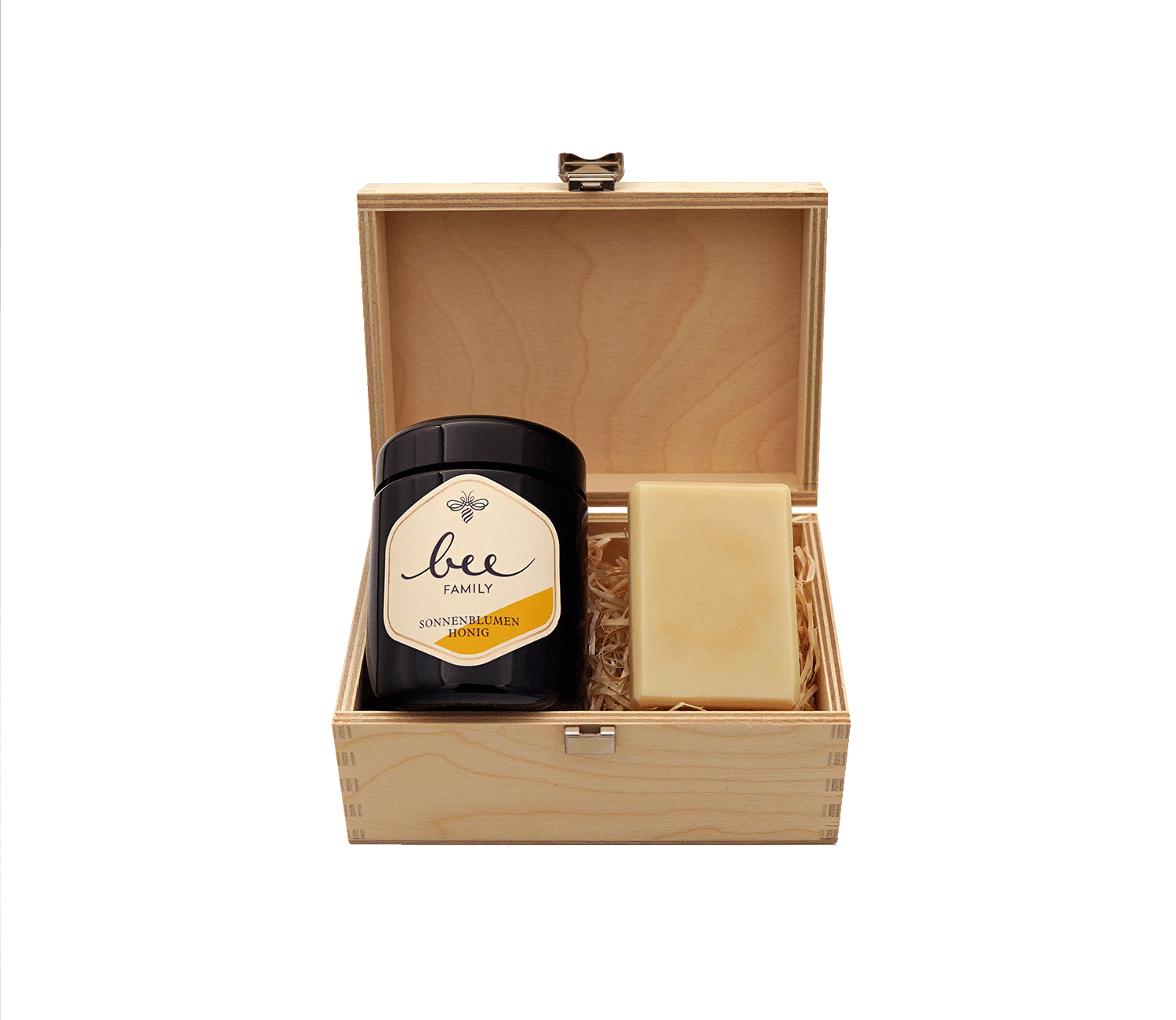 Unser Honigsolo «Honey & Soap» beinhaltet neben einem Honig Ihrer Wahl noch eine von Hand in Arbon hergestellte Honigseife verpackt in einem Bienenwachstuch. Das Set ist verpackt in unserer Bee-Family Holzbox.