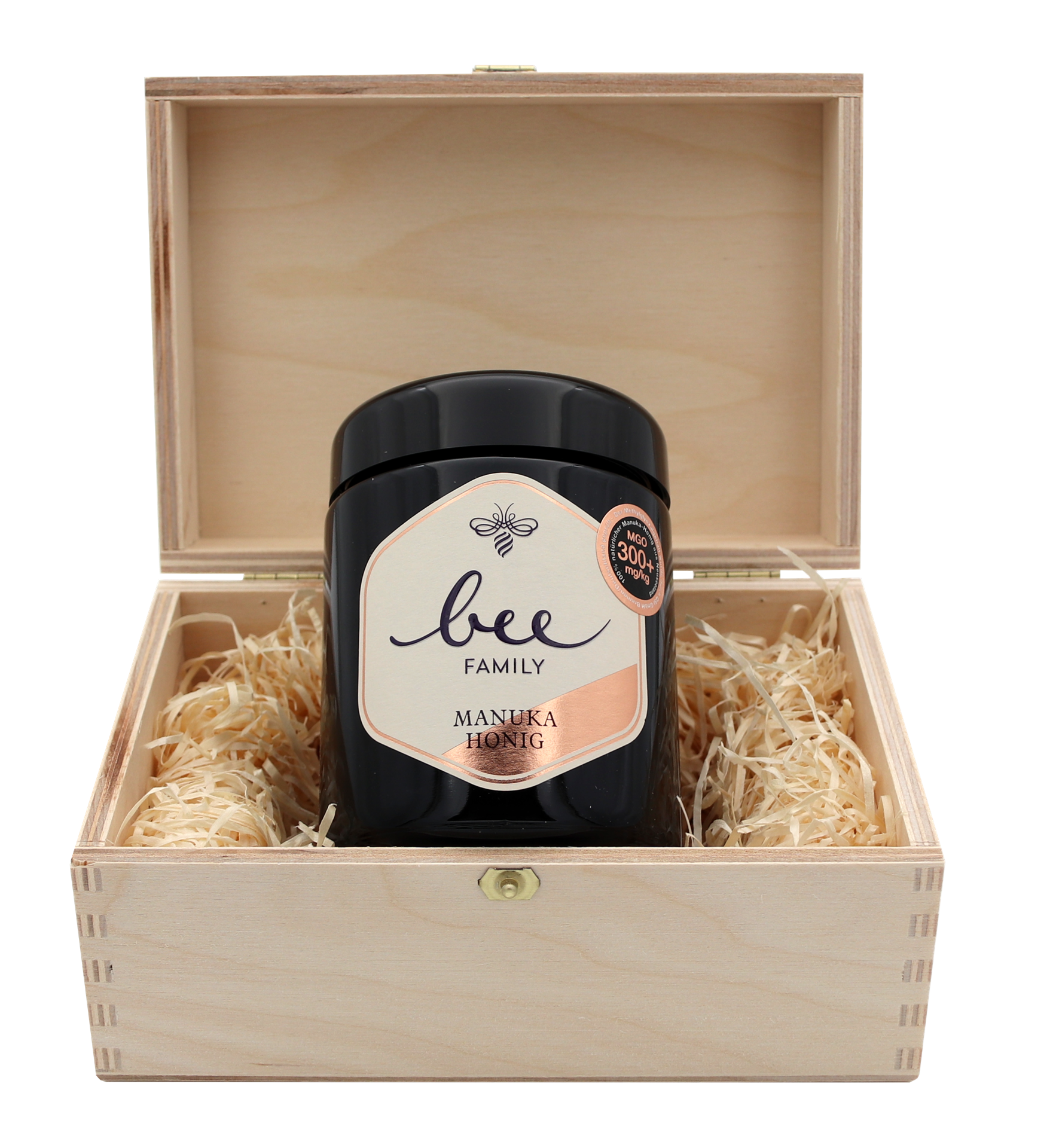 Das Honigsolo „Manuka Gold Edition“ beinhaltet ein Glas unseres edlen Manukahonigs (MGO 300+) in der Bee-Family-Echtholzbox.