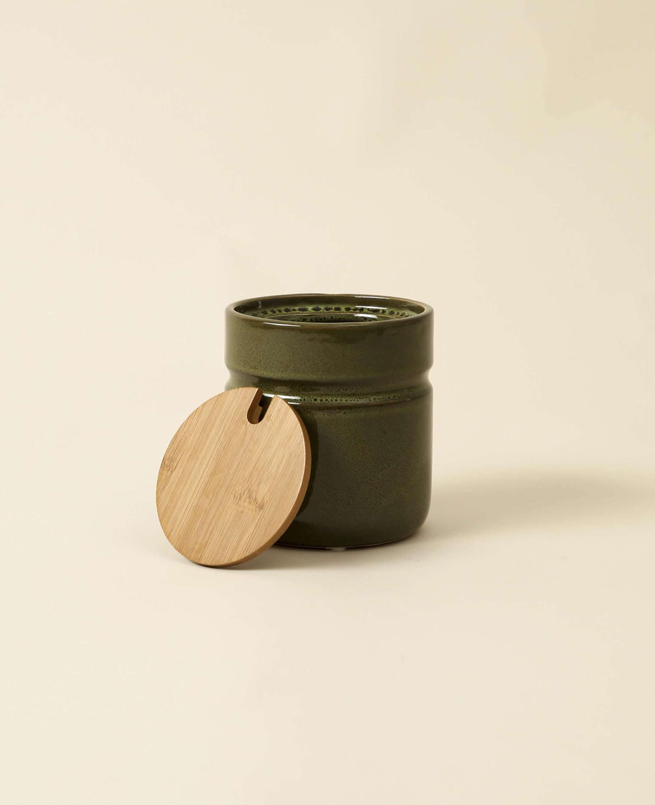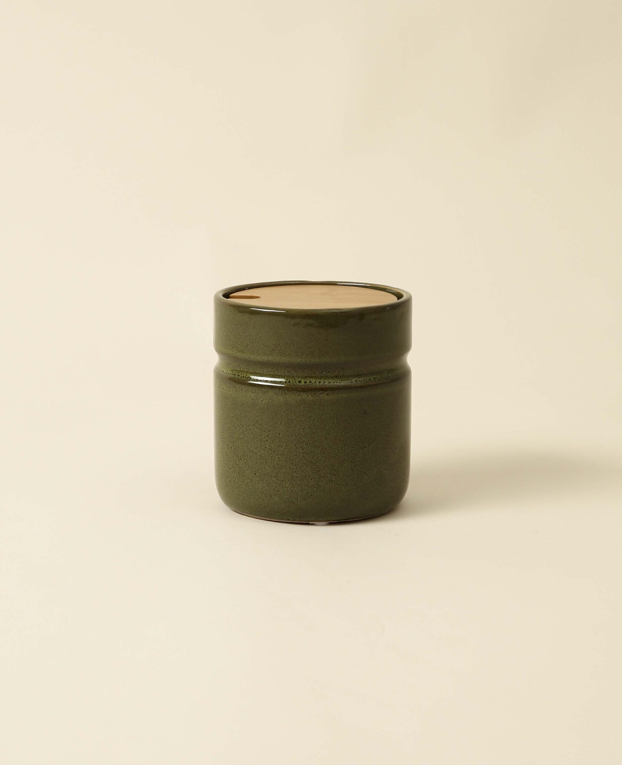 Olivgrüne runde Keramikdose mit Holzdeckel, Ø 11 cm x H 12 cm