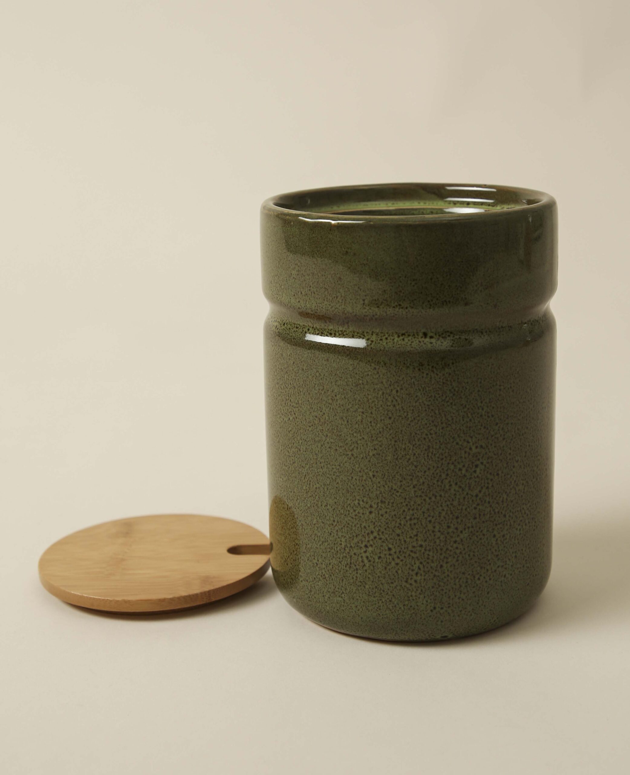 Olivgrüne runde Keramikdose mit Holzdeckel, D 11 cm x H 16 cm