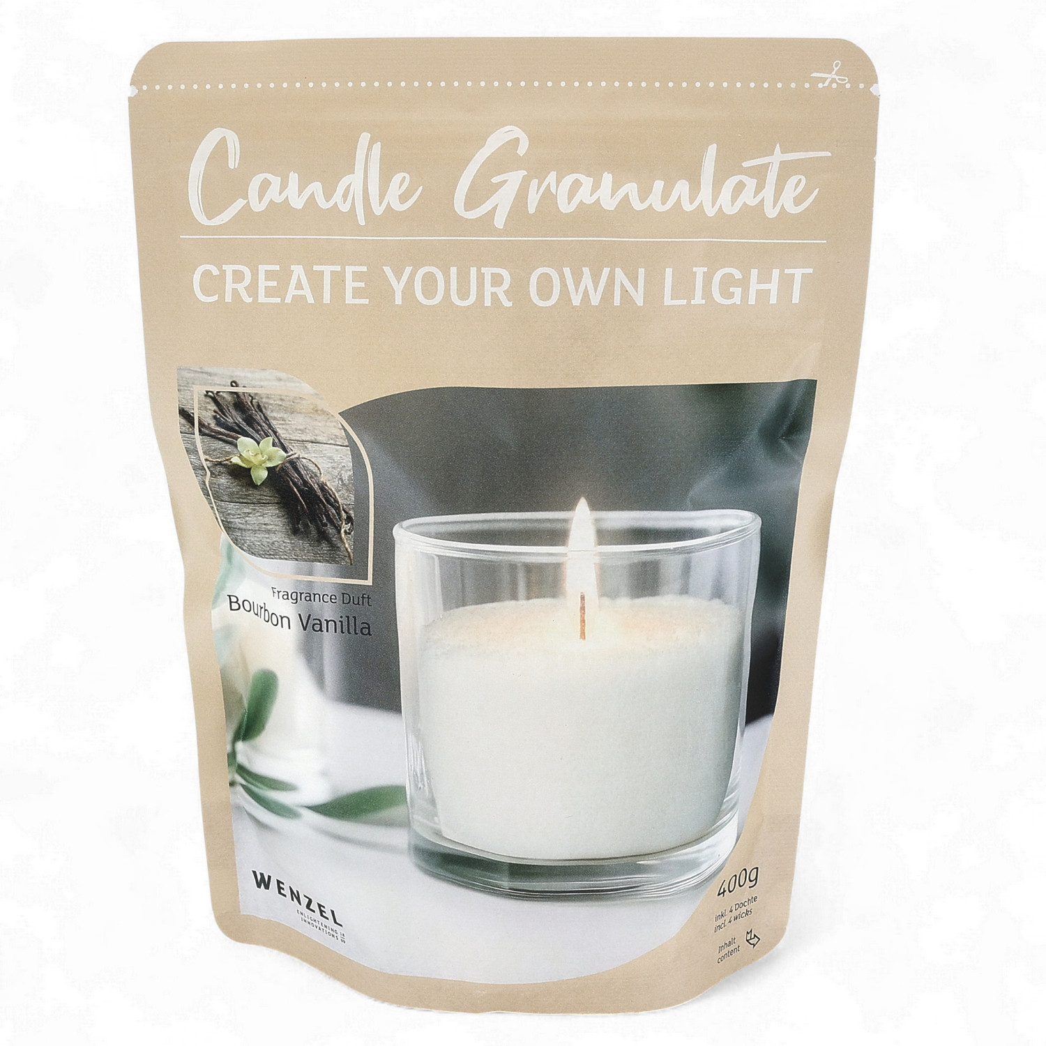 Mit dem Candle Granulate von Wenzel verwandeln Sie jedes hitzebeständige Gefäss, wie z. B. ein Glas, im Handumdrehen in eine einzigartige Kerze. Das feine Wachsgranulat lässt sich einfach einfüllen, individuell dosieren und wiederverwenden – ideal für kreative DIY-Ideen oder als stilvolles Geschenk.