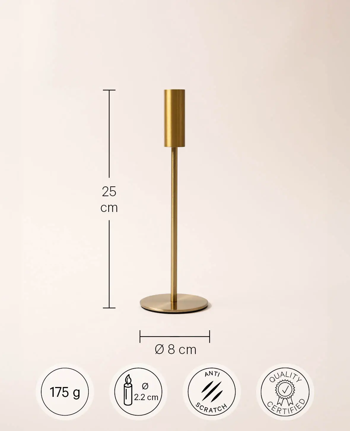 Kerzenständer für Stabkerzen in Messing Gold, Ø 8 x H 25 cm