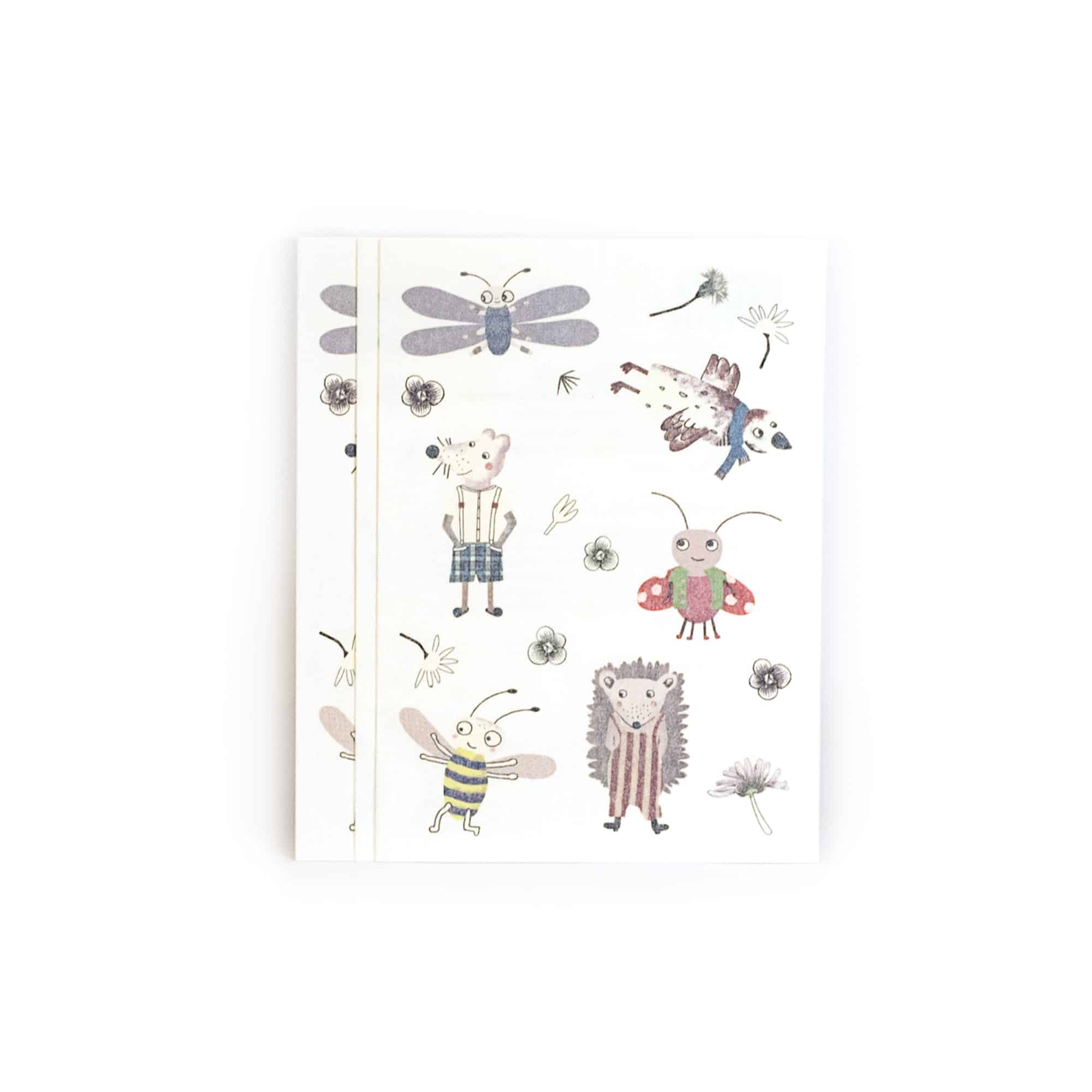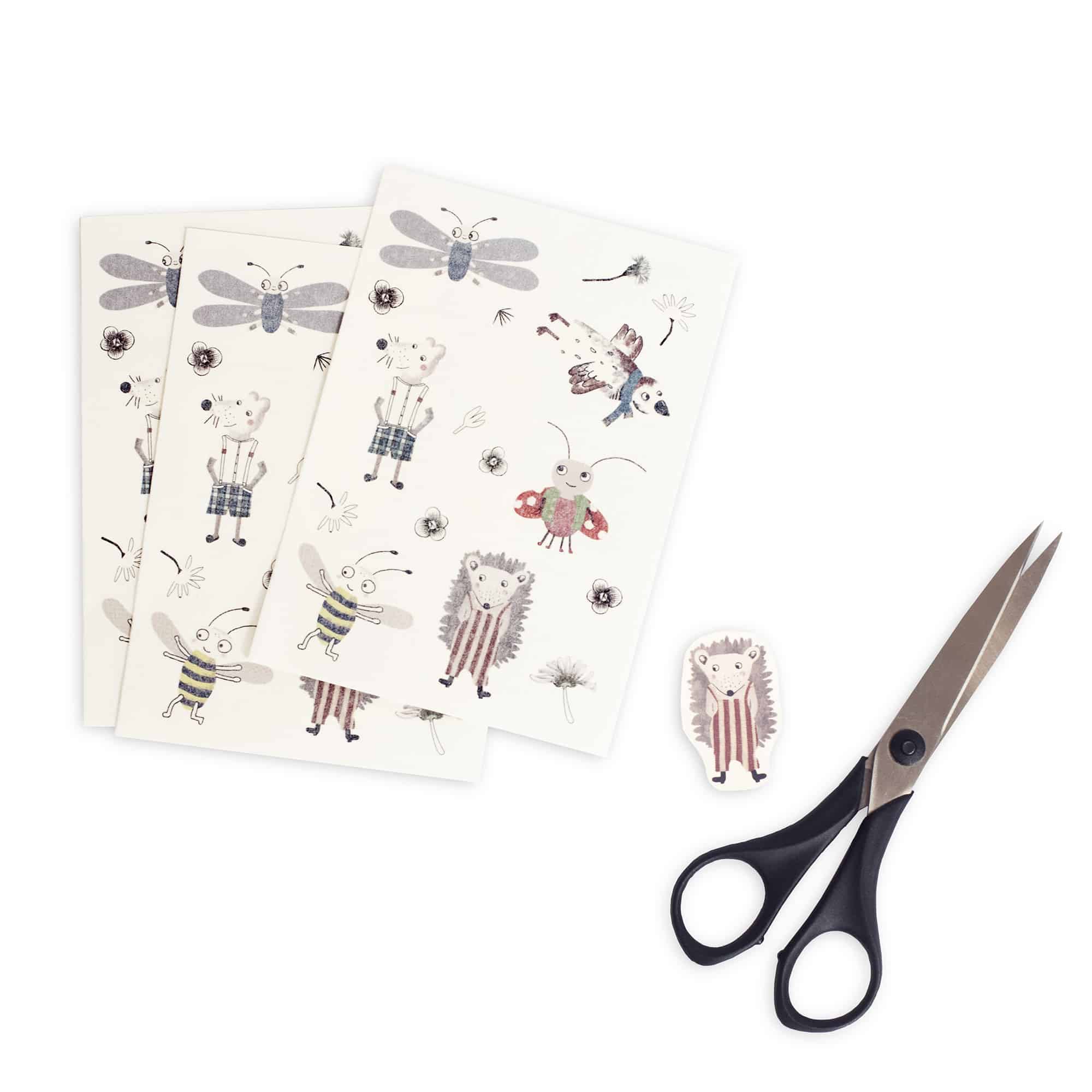 Kraft-Tattoos (Ergänzugs-Set) – drei einzelne Bögen mit je 6 Tier-Tattoos, passend zu den Tierpostkarten und dem Kartenhalter, die in diesem Produkt nicht enthalten sind.