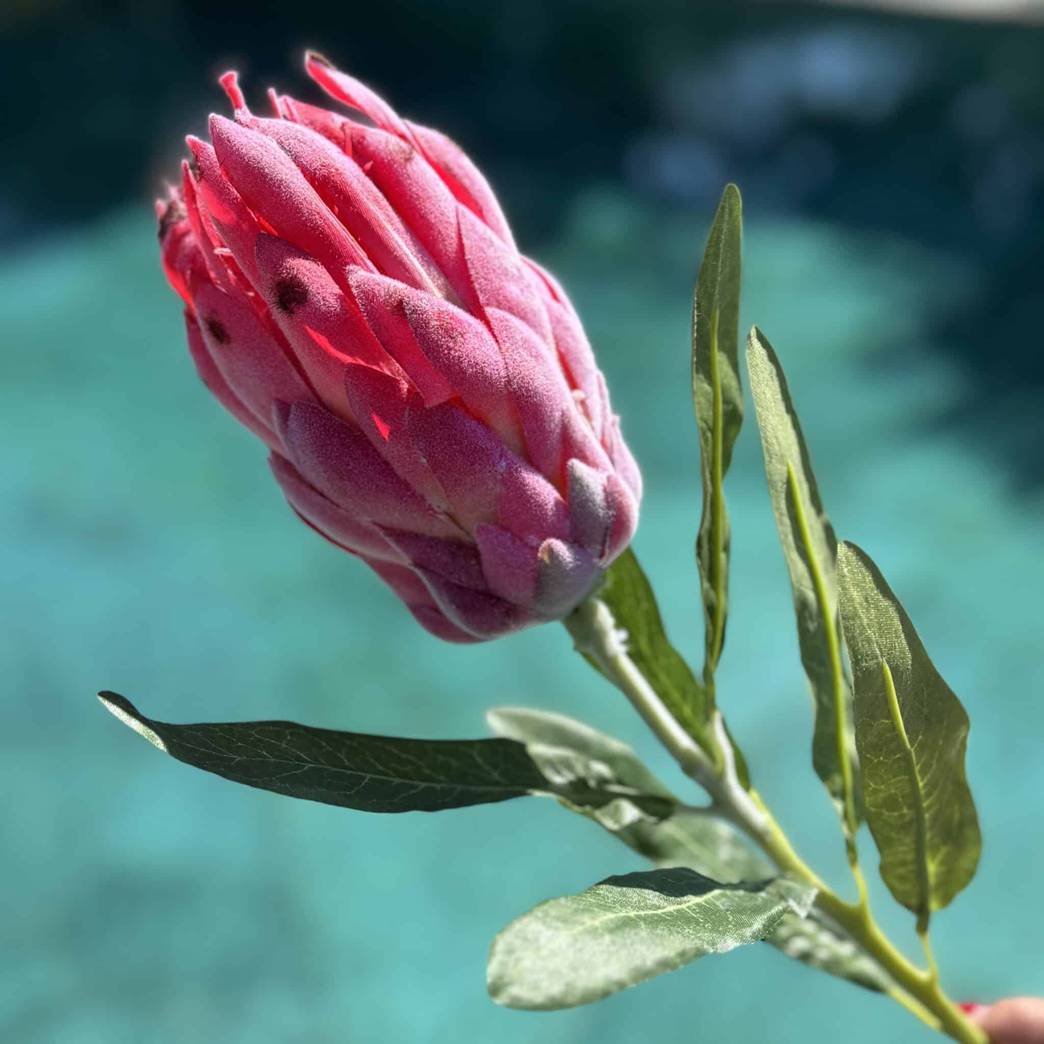 Diese künstliche Protea in Rosa überzeugt durch ihre exotische Form und hochwertige Verarbeitung. Die samtige Blüte und die filigranen Blätter wirken täuschend echt und setzen stilvolle Akzente – ob einzeln arrangiert oder in Kombination mit anderen Kunstpflanzen. Ideal für moderne Dekorationen, ganz ohne Pflegeaufwand.