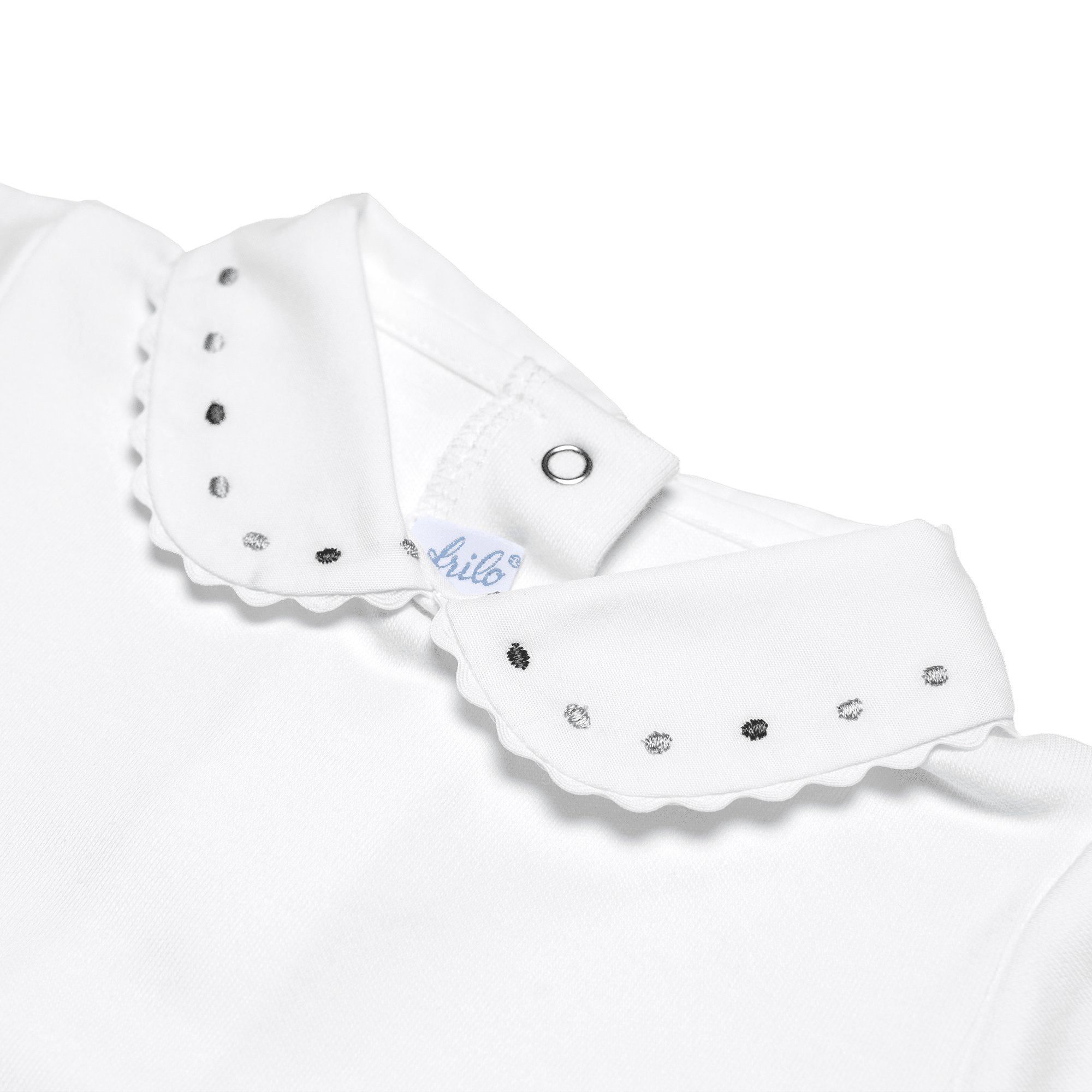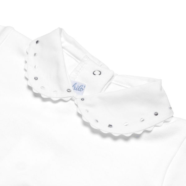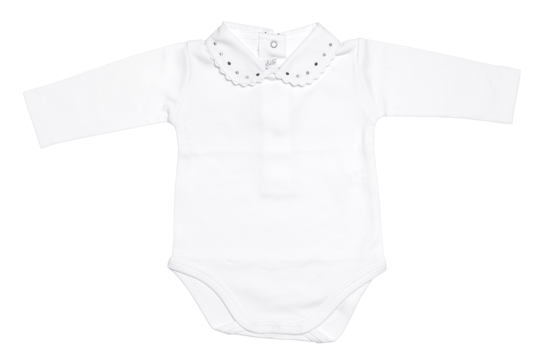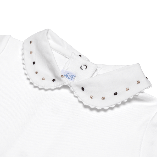 100% feinster Baumwolle: Der Baby-Body mit Stickerei-Kragen in verschiedenen farbigen Punkten von frilo lassen wir passend zu unserem Strick, in Europa produzieren.