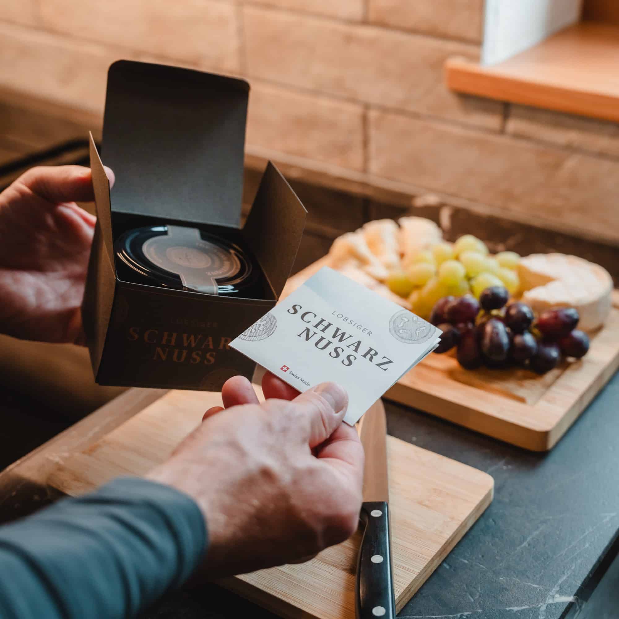 Die Lobsiger Schwarznuss ist eine veredelte Baumnuss von unserem Familienbetrieb in Lobsigen im Berner Seeland. Wir ernten unsere Nüsse von Hand – spätestens am Johannistag zur Sommersonnenwende, bevor sie reif sind. Dann haben sie bereits die Energie der Erde aufgenommen, die Frucht jedoch ist unreif und die Schale noch nicht ausgehärtet. Anschliessend veredeln wir die rohe Frucht während vier Wochen mit viel Herzblut in reiner Handarbeit mit kulinarischem Fingerspitzengefühl zu einer kostbaren Delikatesse.
