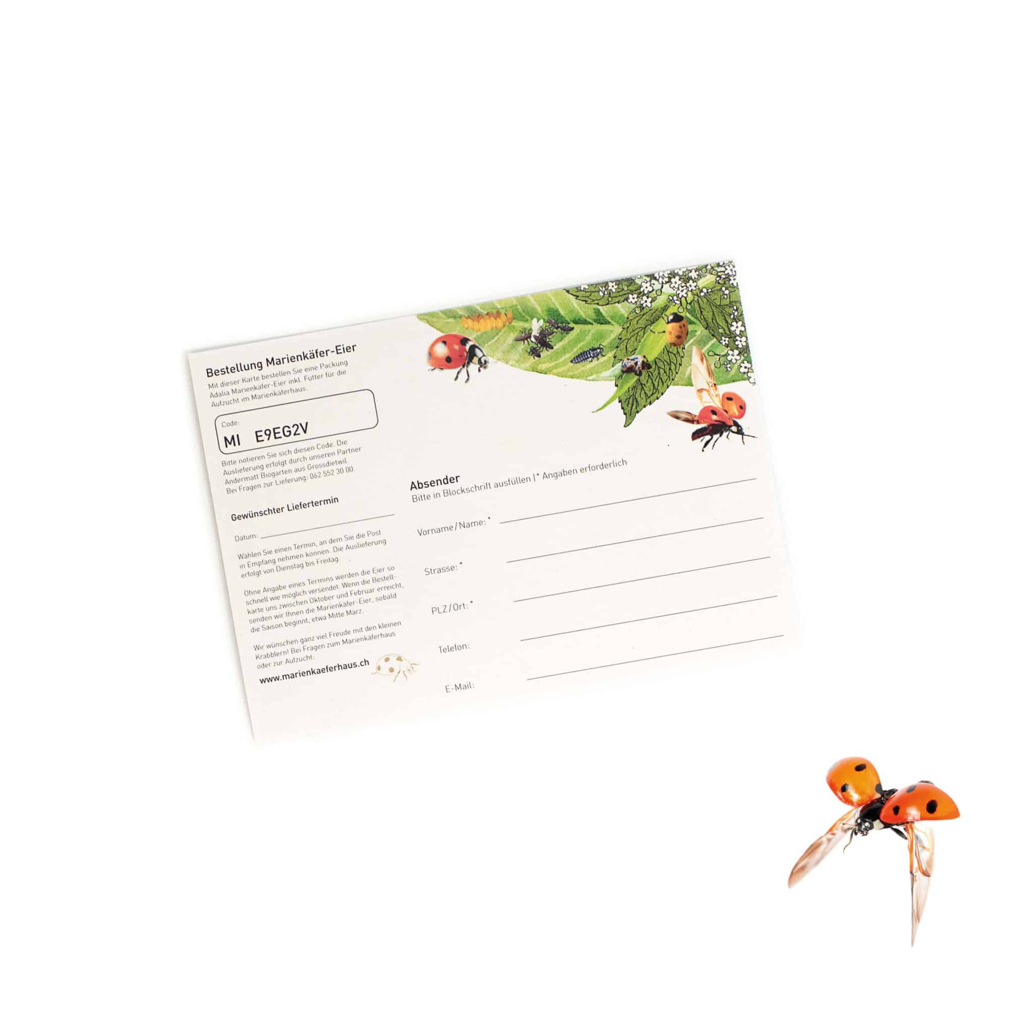 Eine vorfrankierte Bezugskarte (Gutschein) für Marienkäfer-Eier aus der Biogärtnerei.