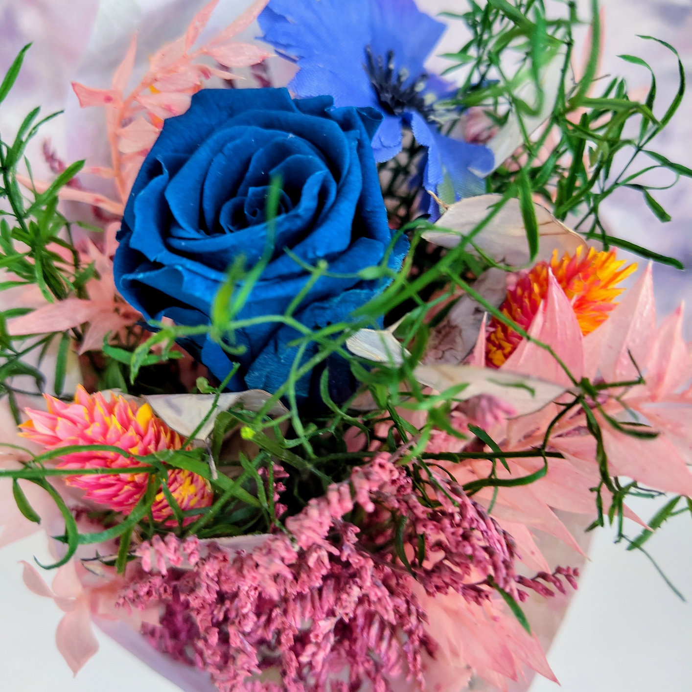 Ein hübscher kleiner Strauss, der dein Zuhause verschönert oder sich ideal als Geschenk für Freunde und Verwandte eignet. Dieser 100 % natürliche Strauß hält mehrere Jahre und wird garantiert Freude bereiten.