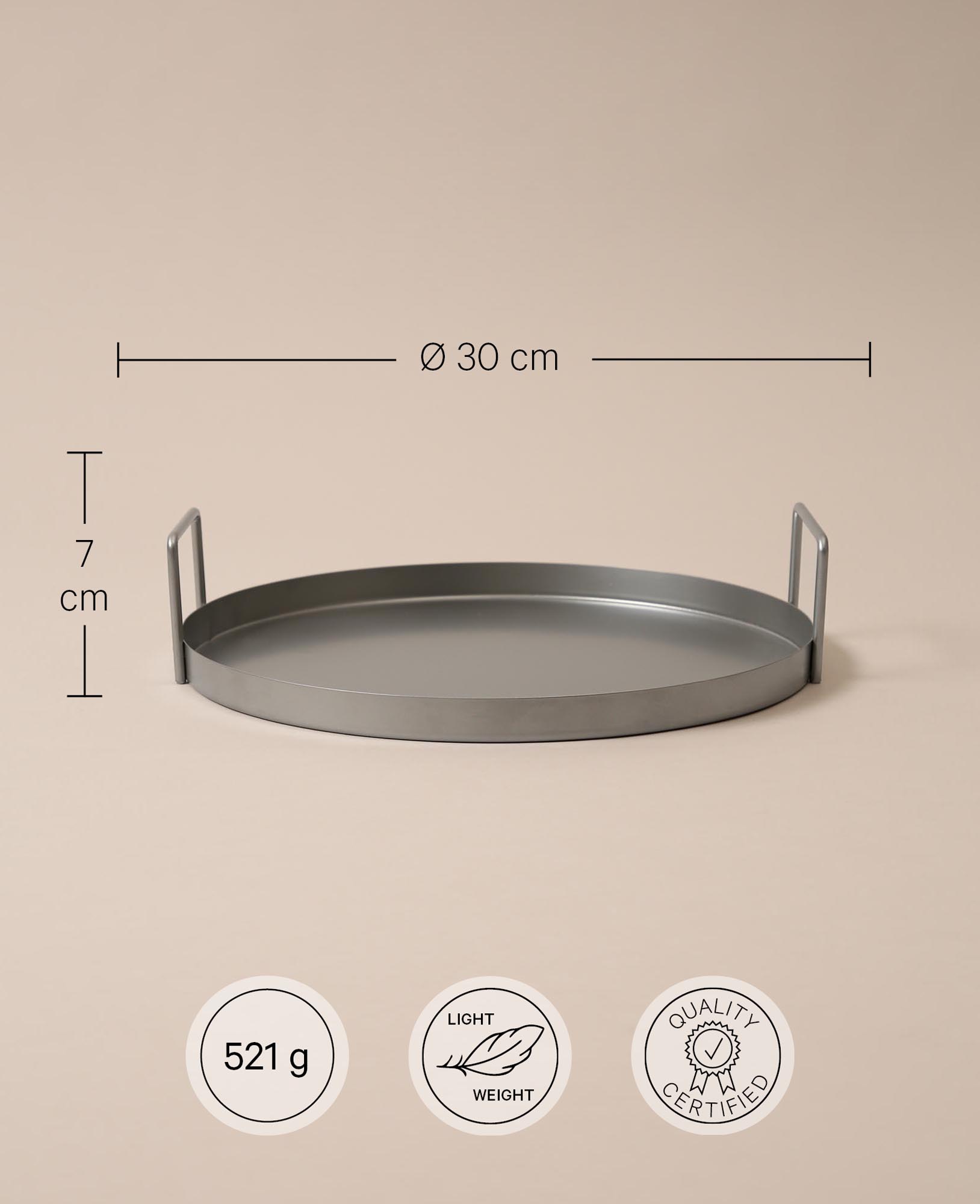 Unser silbriges Metalltablett mit Griffen ist ein elegantes und praktisches Accessoire für jeden Haushalt. Mit dem Durchmesser von 30 cm bietet es genug Platz für verschiedene Gegenstände wie Gläser, Tassen oder Snacks. Das schlichte und moderne Design verleiht dem Tablett eine zeitlose Ästhetik, die zu jedem Einrichtungsstil passt.