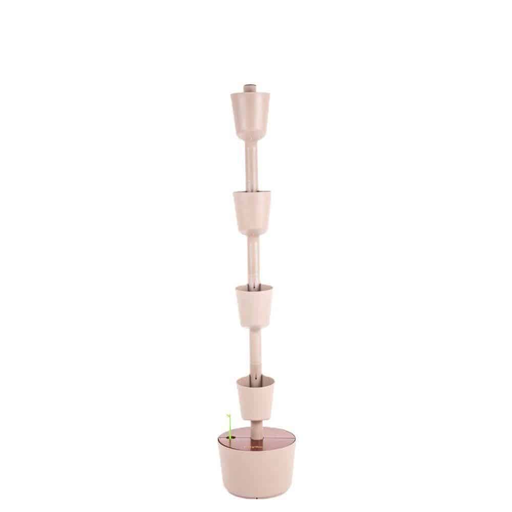 Vertikales Pflanzgefäss in der Farbe Kiefernrinde und Deckel aus Teakholz. Modular und anpassbar. Modell mit 4 Töpfen. Platzieren Sie die Töpfe in verschiedenen Positionen. Höhe 148 cm. Durchmesser der Töpfe 13 cm.