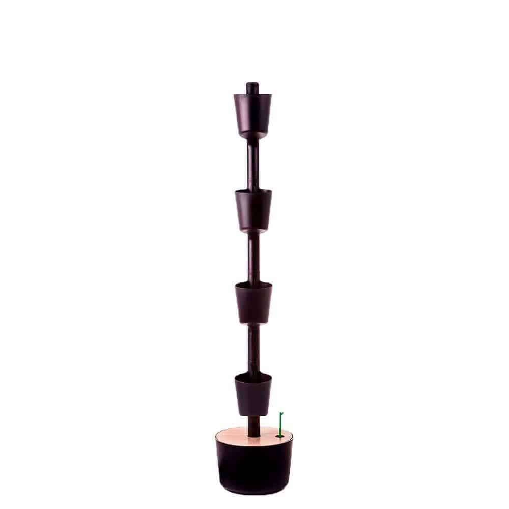 Vertikales Pflanzgefäss in schwarzer Farbe und Deckel aus Kiefernholz. Modular und anpassbar. Modell mit 4 Töpfen.