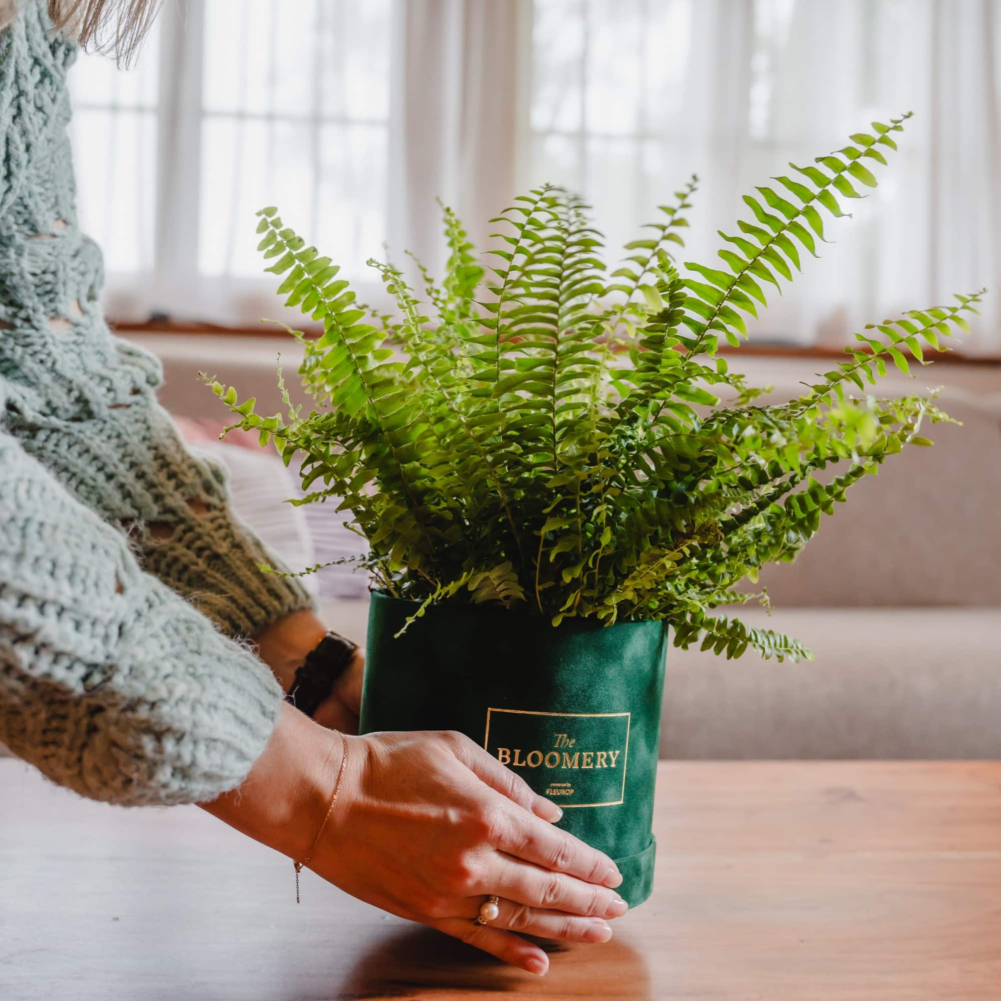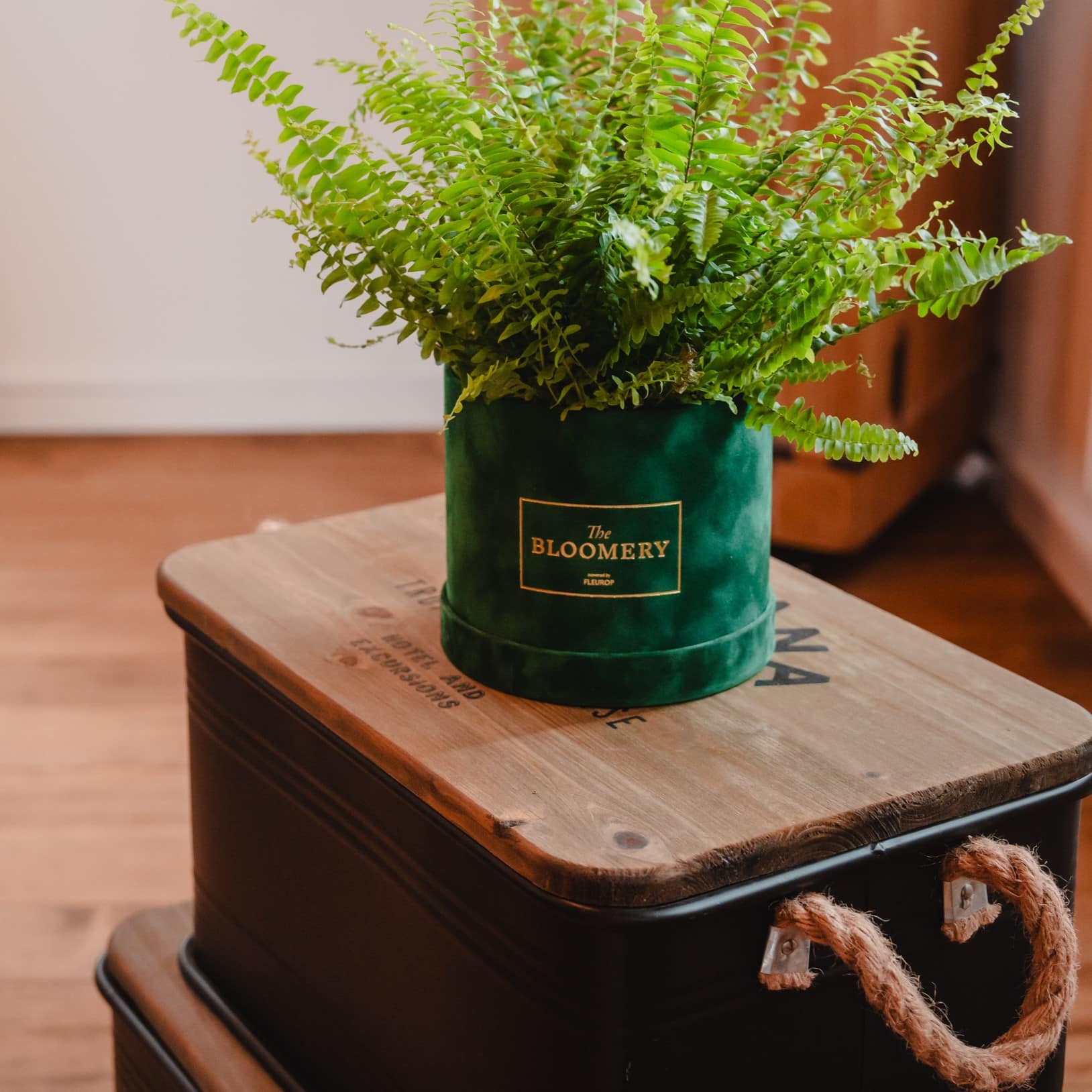 Nephrolepis / Schwertfarn in einer wunderschönen dunkelgrünen Samtbox. Eine dekorative und aus dem Rahmen fallende Alternative zu einem gewöhnlichen Pflanzgefäss.
