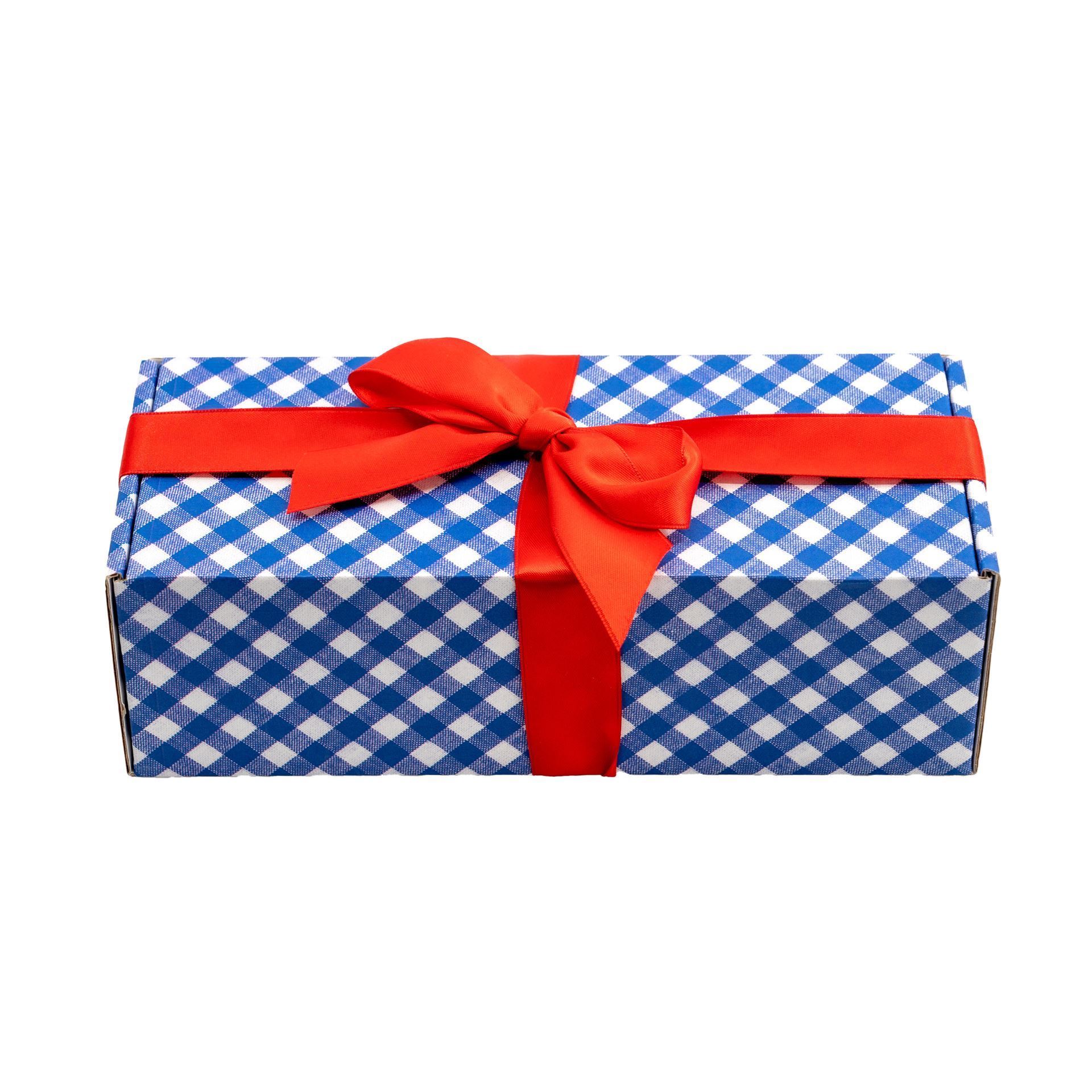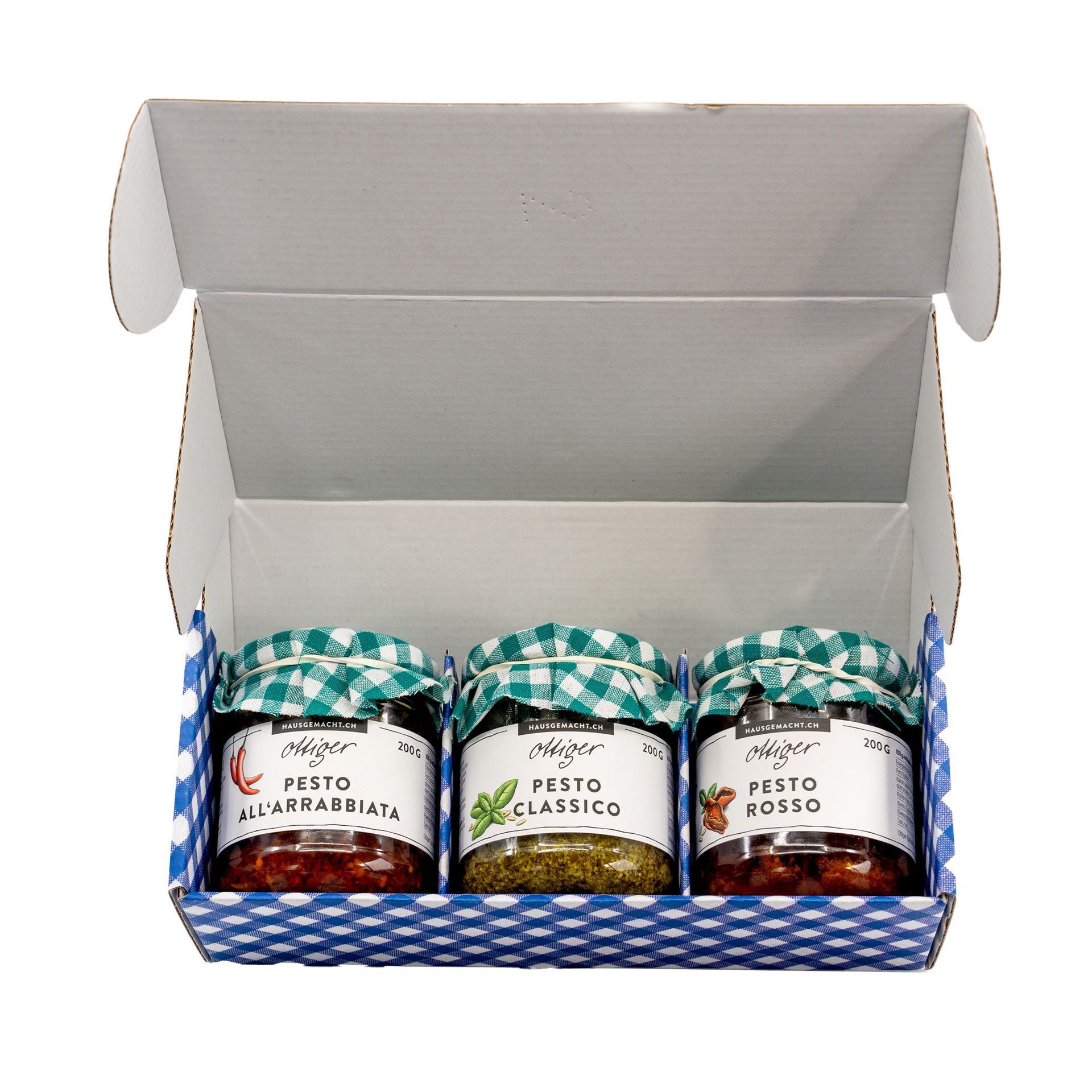 3 hausgemachte Pestos von Ottiger Spezialitäten, verpackt in blau-weiss karierter Geschenkbox mit rotem Geschenkband.