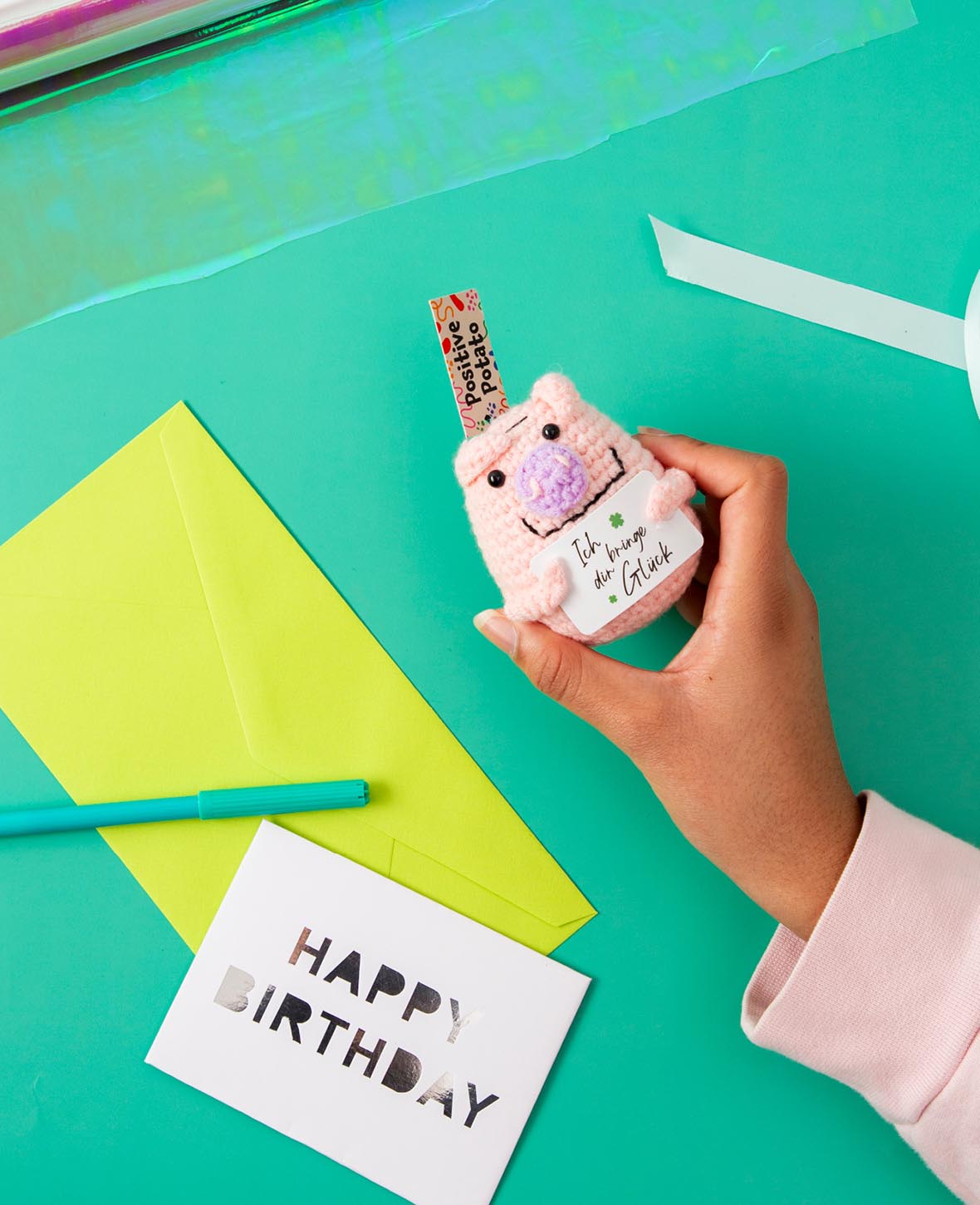 Positive Pig, Gehäkeltes Mini Plüschtier / Glücksbringer, Rosa, 7 x 6 cm
