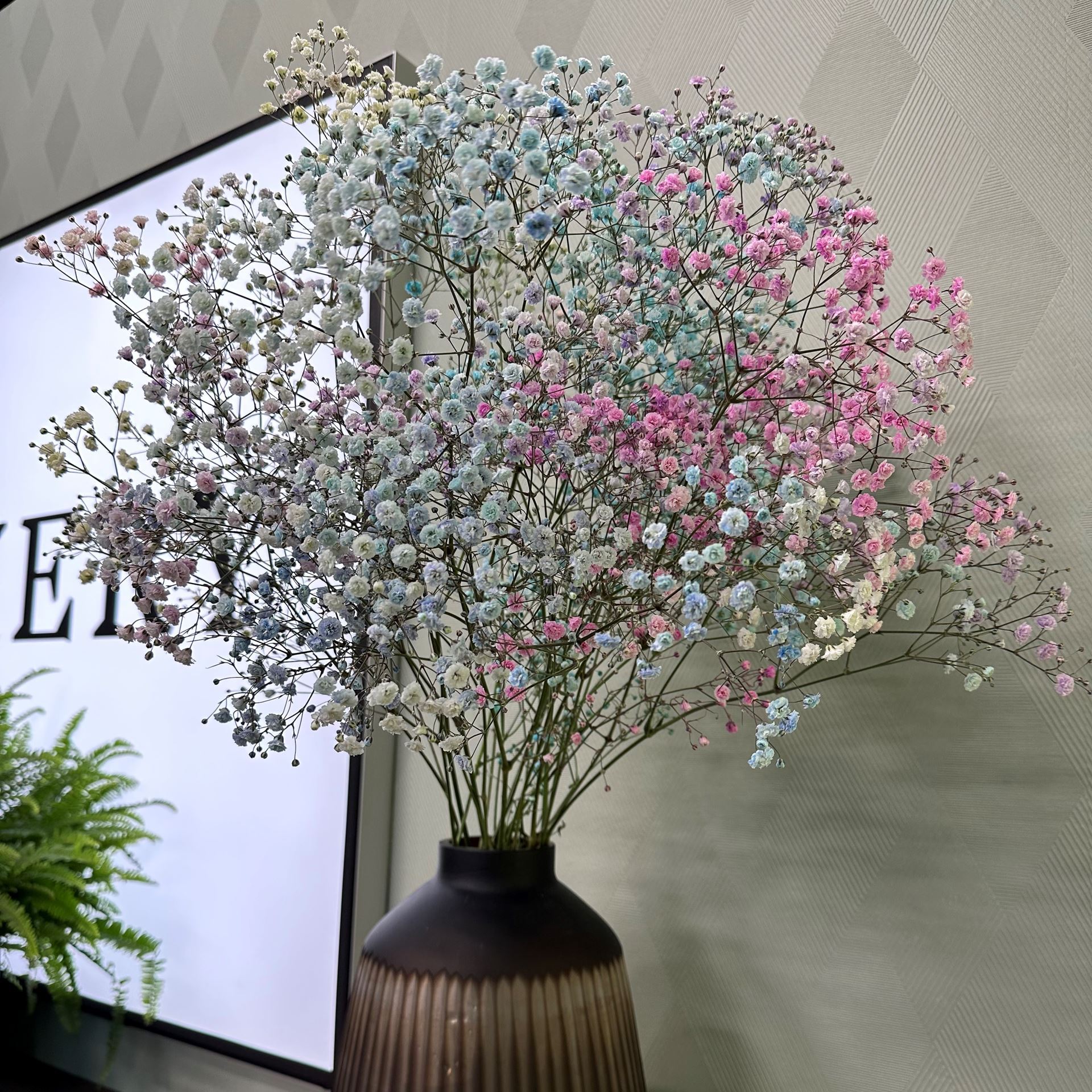 5 Stiele Rainbow-Schleierkraut mit Naturschnur zusammengebunden. Verpackt in farbigem Graspapier, perfekt für zu Hause oder als Geschenk.