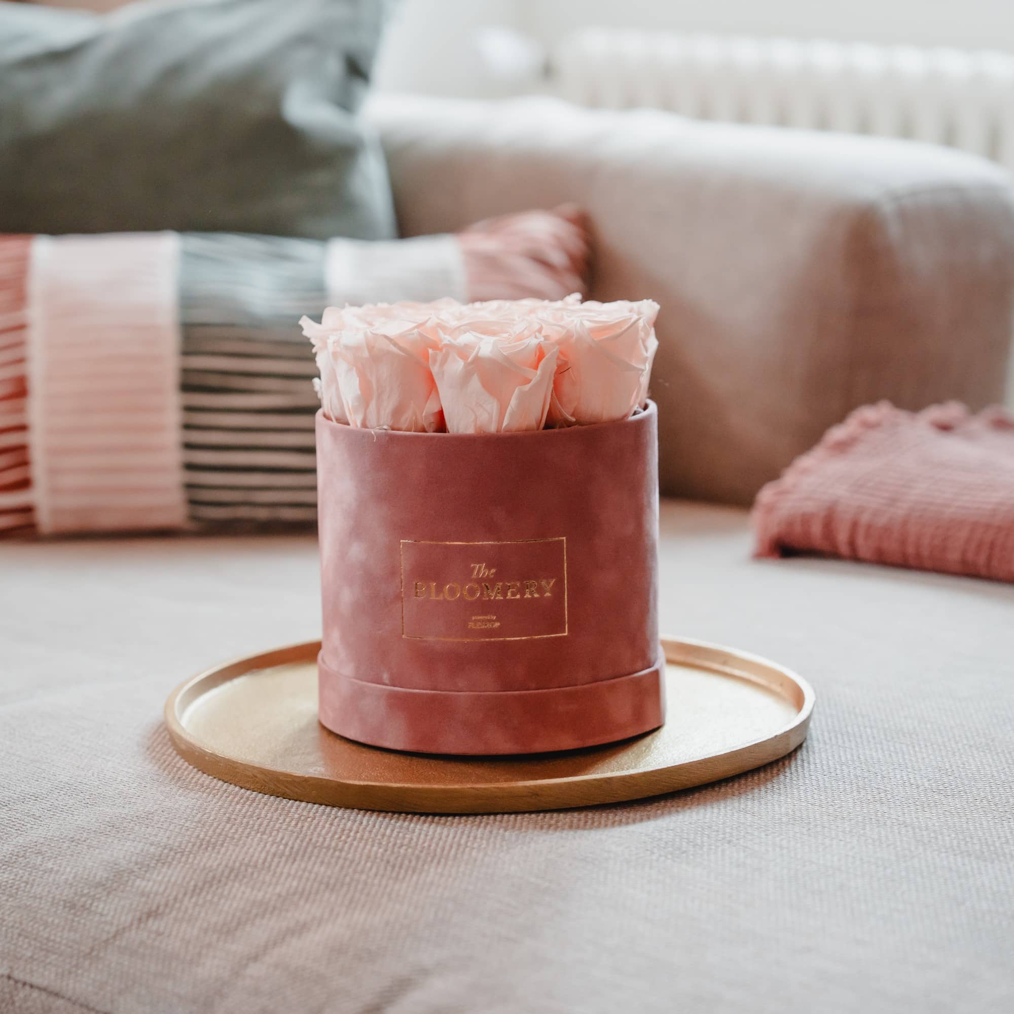 Die Rosenbox, Ø ca. 15 cm, H ca. 20 cm, ist klassisch und elegant im Design, mit wunderschönem Samt Stoff und wird dir zu Hause oder jedem Beschenkten lange Freude bereiten.