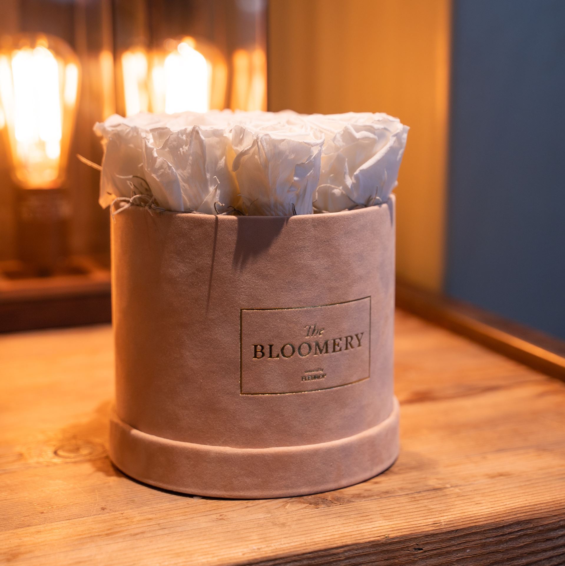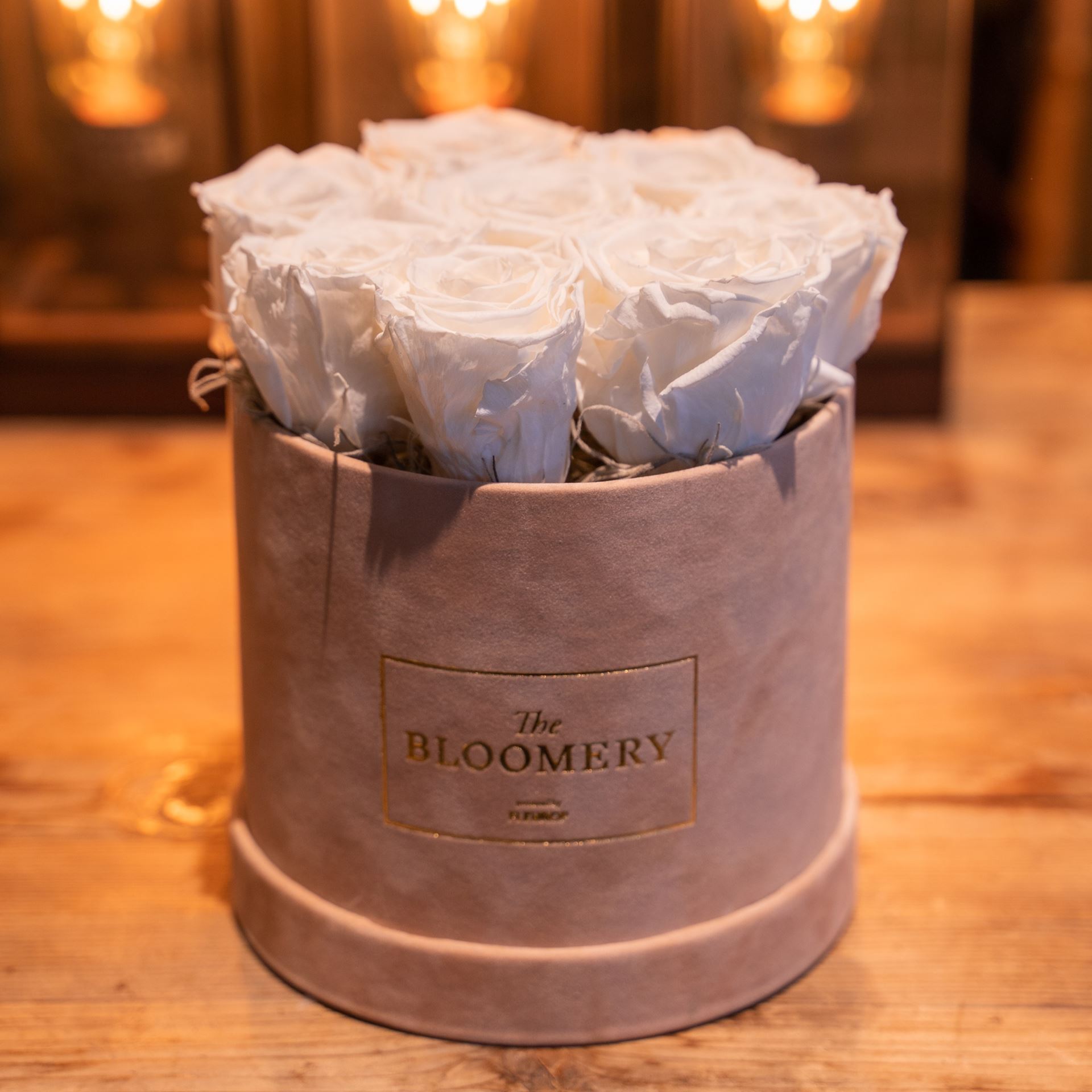 Rosenbox in Sand Samt, mit 8 stabilisierten Rosen Ivory, Ø 15 cm